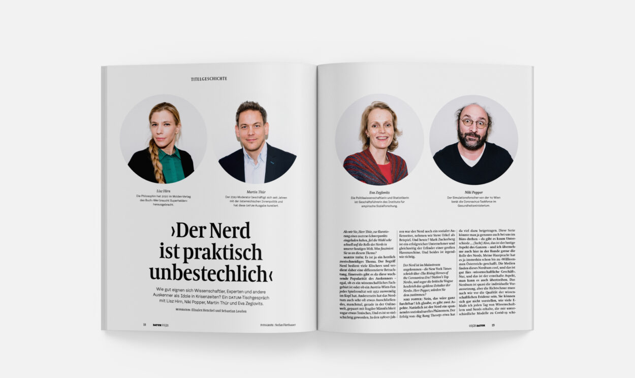 Niki Popper : Nein, das wäre ganz furchtbar ! Ich glaube, es gibt zwei Aspekte. Natürlich ist der Nerd ein spannendes soziokulturelles Phänomen. Der Erfolg von › Big Bang Theory ‹ etwa hat da viel dazu beigetragen. Diese Serie könnte man ja genauso auch bei uns im Büro drehen – da gibt es kaum Unterschiede … (lacht) Also, das ist der lustige Aspekt des Ganzen – und ich übernehme auch hier in der Runde gerne die Rolle des Nerds. Meine Haarpracht hat es ja immerhin schon bis zu › Willkommen Österreich ‹ geschafft. Die Medien finden dieses Nerdtum cool, und das ist gut fürs › wissenschaftliche Geschäft ‹. Nur, und das ist der ernsthafte Aspekt, man kann es auch übertreiben. Das Nerdtum ist quasi die individuelle Voraussetzung, aber die Richtschnur muss nach wie vor die Qualität der wissenschaftlichen Evidenz sein. Sie können sich gar nicht vorstellen, wie viele E-Mails ich jeden Tag von Wissenschaftlern und Nerds erhalte, die mir unterschiedliche Modelle zu Covid-19 schicken. Manche glauben, da kann man schnell einmal etwas Grandioses beitragen. Wir beschäftigen uns seit 20 Jahren damit, man muss immer weiter arbeiten – das ist wahrscheinlich das › Nerdige ‹, das wichtig ist. Also : Das Nerdtum muss professionalisiert werden, dann darf es auch gerne eine Hochblüte erleben.