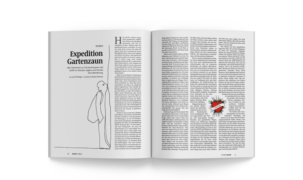 Ich muss klarstellen: Bei meiner Geschichte stand eindeutig das Gehen im Vordergrund, nicht das Schreiben. Ich wollte bloß mal zu Fuß von Wien bis ans Meer gehen. Nicht mehr, aber auch nicht weniger. Erst danach suchte ich dafür ein Medium, und DATUM zeigte sich interessiert. Obwohl das Ganze schon so lange zurückliegt, weiß ich noch eines: Mein Schreibtisch war beim Aufschreiben der Eindrücke mit Wanderkarten zugepflastert, denn ich musste meine Erinnerungen und Notizen immer