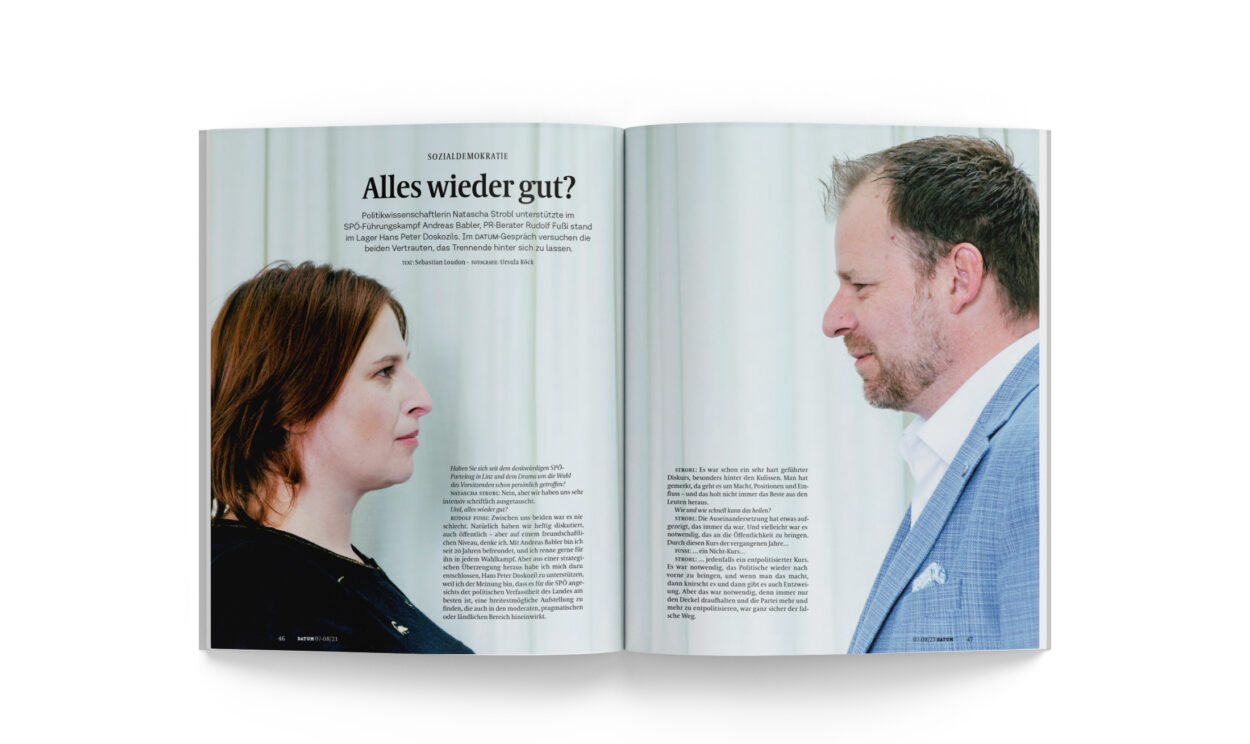 Politikwissenschaftlerin Natascha Strobl unterstützte im SPÖ-Führungskampf Andreas Babler, PR-Berater Rudolf Fußi stand im Lager Hans Peter Doskozils. Im DATUM-Gespräch versuchen die beiden Vertrauten, das Trennende hinter sich zu lassen.