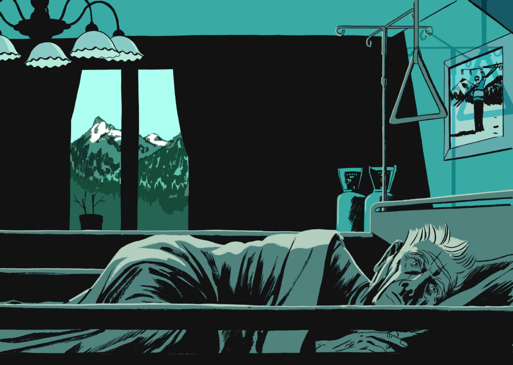 Über dem Bett hängt ein Foto. Es zeigt einen Mann in schwarzen Wanderschuhen, hochgekrempelter Hose und umgeschlagenen Hemdsärmeln, in der linken Hand einen Skistock. Er steht auf einer Eisfläche, hinter ihm thronen die weißen Bergspitzen der Alpen. Jetzt stehen die Wanderschuhe zwei Armlängen vom Bett entfernt, oben auf dem Schrank. Das Bett von Herr Neumaier ist auf jeder Seite von Holzlatten umgeben – auf den kurzen Seiten des Bettes je eine, auf den langen je zwei. Nur ein Brett hängt schräg in der Halterung. Herr Neumaier ist zu schwach, um darüber zu klettern.