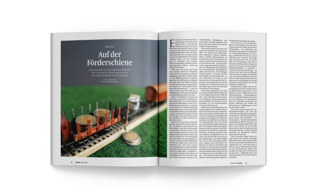 Wenn man sich auf die Suche nach dem teuersten Rechtssatz Österreichs macht, wäre der Paragraph 42 im Bundesbahngesetz zumindest ein heißer Anwärter. ›Die ÖBB-Infrastruktur AG trägt die Kosten für die Erfüllung ihrer Aufgaben. Der Bund leistet der ÖBB-Infrastruktur AG über deren Ersuchen insbesondere für den Betrieb der Schieneninfrastruktur und deren Bereitstellung (…) einen Zuschuss. Weiters leistet der Bund zur Instandhaltung, zur Planung und zum Bau von Schieneninfrastruktur Zuschüsse.‹