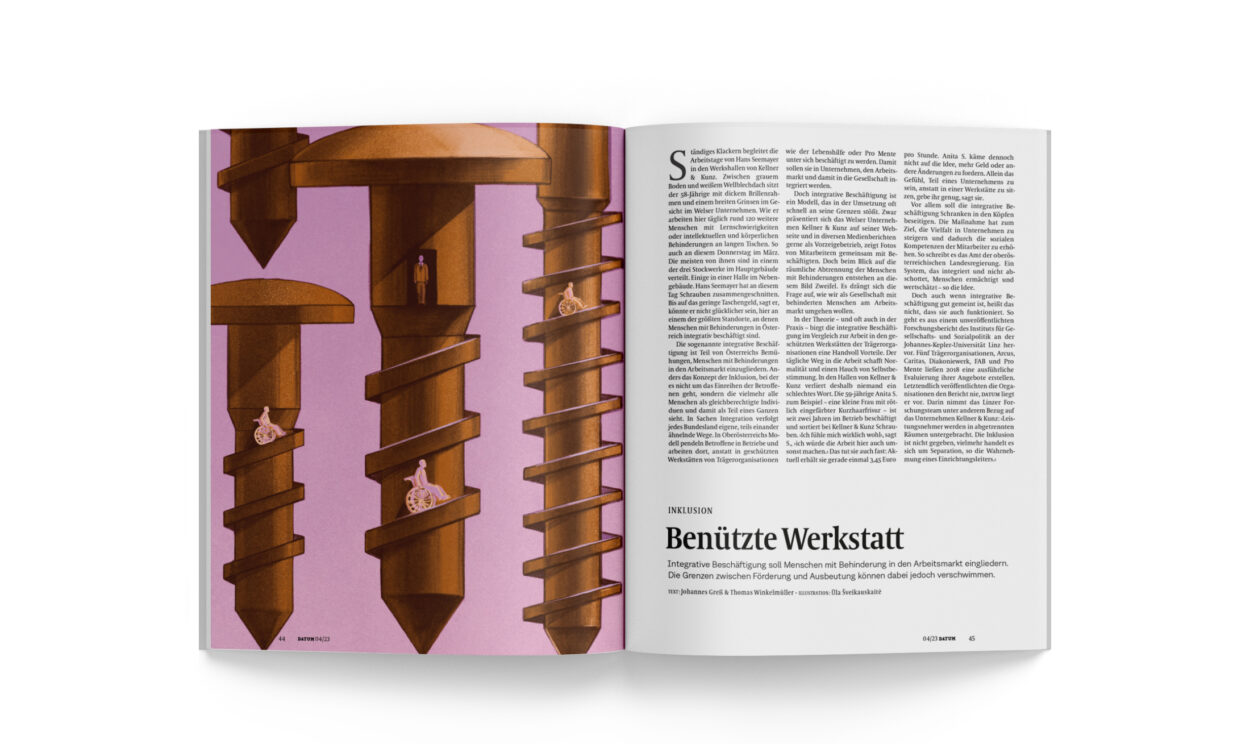 Doch auch wenn integrative Beschäftigung gut gemeint ist, heißt das nicht, dass sie auch funktioniert. So geht es aus einem unveröffentlichten Forschungsbericht des Instituts für Gesellschafts- und Sozialpolitik an der Johannes-Kepler-Universität Linz hervor. Fünf Trägerorganisationen, Arcus, Caritas, Diakoniewerk, FAB und Pro Mente ließen 2018 eine ausführliche Evaluierung ihrer Angebote erstellen. Letztendlich veröffentlichten die Organisationen den Bericht nie, DATUM liegt er vor. Darin nimmt das Linzer Forschungsteam unter anderem Bezug auf das Unternehmen Kellner & Kunz: ›Leistungsnehmer werden in abgetrennten Räumen untergebracht. Die Inklusion ist nicht gegeben, vielmehr handelt es sich um Separation, so die Wahrnehmung eines Einrichtungsleiters.‹