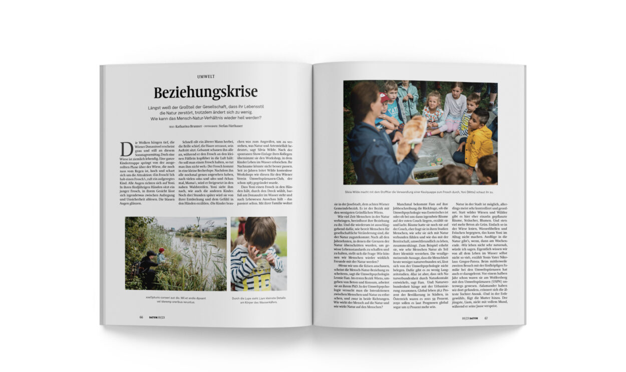 Schnell eilt ein älterer Mann herbei, die Brille schief, die Haare zerzaust, sein Auftritt sitzt. Gebannt schauen ihn alle an, während er den Frosch an den kleinen Füßlein kopfüber in die Luft hält: ›So soll man einen Frosch halten, so tut man ihm nicht weh.‹ Der Frosch kommt in eine kleine Becherlupe. Nachdem ihn alle nochmal genau angesehen haben, nach vielen ›ohs‹ und ›ahs‹ und ›Schau mal, Mama!‹, wird er freigesetzt in den nahen Waldstreifen. Yoni sieht ihm nach, wie auch die anderen Kinder. Noch drei Stunden später wird sie von ihrer Entdeckung und dem Gefühl in den Händen erzählen. ›Die Kinder brauchen was zum Angreifen, um zu verstehen, was Natur und Artenvielfalt bedeutet‹, sagt Silvia Wilde. Nach der spontanen Show-Einlage ihres Kollegen übernimmt sie den Workshop, in dem Kinder Leben im Wasser erforschen. Ihr Nachname könnte nicht besser passen. Seit 20 Jahren leitet Wilde kostenlose Workshops wie diesen für den Wiener Verein Umweltspürnasen-Club, der schon 1983 gegründet wurde.