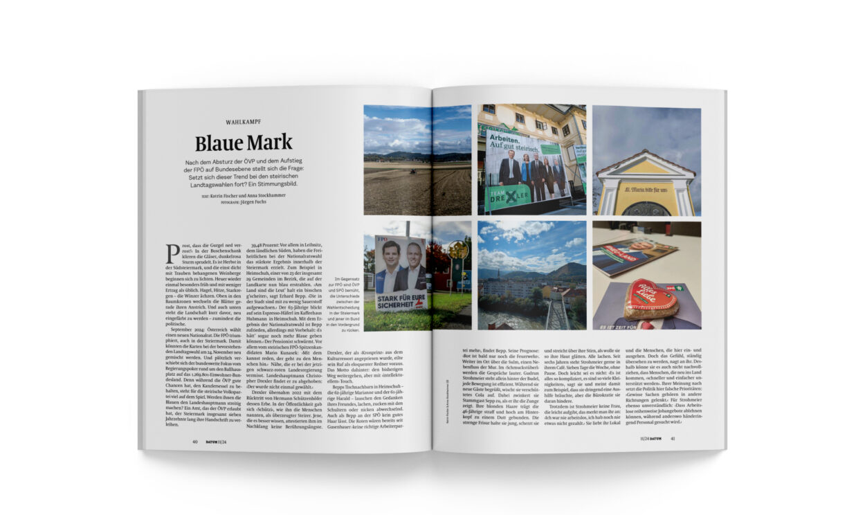 39,48 Prozent: Vor allem in Leibnitz, dem ländlichen Süden, haben die Freiheitlichen bei der Nationalratswahl das stärkste Ergebnis innerhalb der Steiermark erzielt. Zum Beispiel in Heimschuh, einer von 23 der insgesamt 29 Gemeinden im Bezirk, die auf der Landkarte nun blau erstrahlen. ›Am Land sind die Leut’ halt ein bisschen g’scheiter‹, sagt Erhard Bepp. ›Die in der Stadt sind mit zu wenig Sauerstoff aufgewachsen.‹ Der 63-Jährige blickt auf sein Espresso-Häferl im Kaffeehaus Hubmann in Heimschuh. Mit dem Ergebnis der Nationalratswahl ist Bepp zufrieden, allerdings mit Vorbehalt: ›Es hätt’ sogar noch mehr Blaue geben können.‹ Der Pensionist schwärmt. Vor allem vom steirischen FPÖ-Spitzenkandidaten Mario Kunasek: ›Mit dem kannst reden, der geht zu den Menschen hin.‹ Nähe, die er bei der jetzigen schwarz-roten Landesregierung vermisst. Landeshauptmann Christopher Drexler findet er zu abgehoben: ›Der wurde nicht einmal gewählt.‹