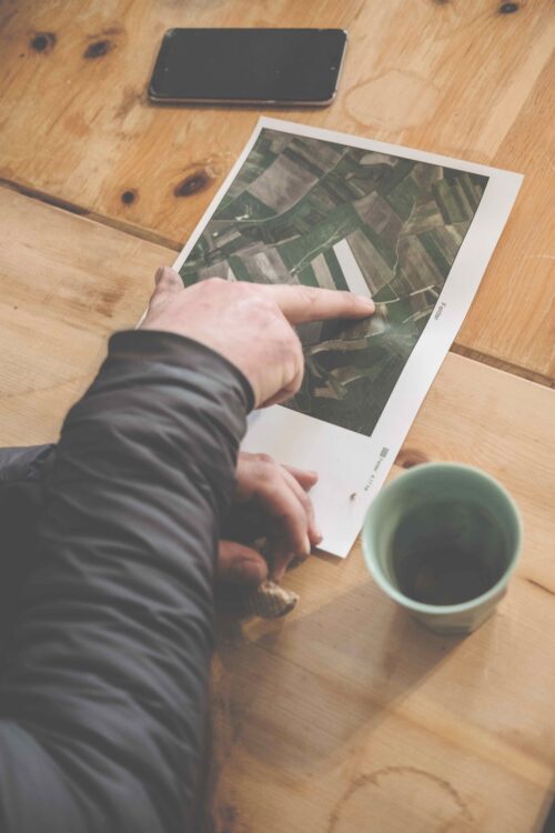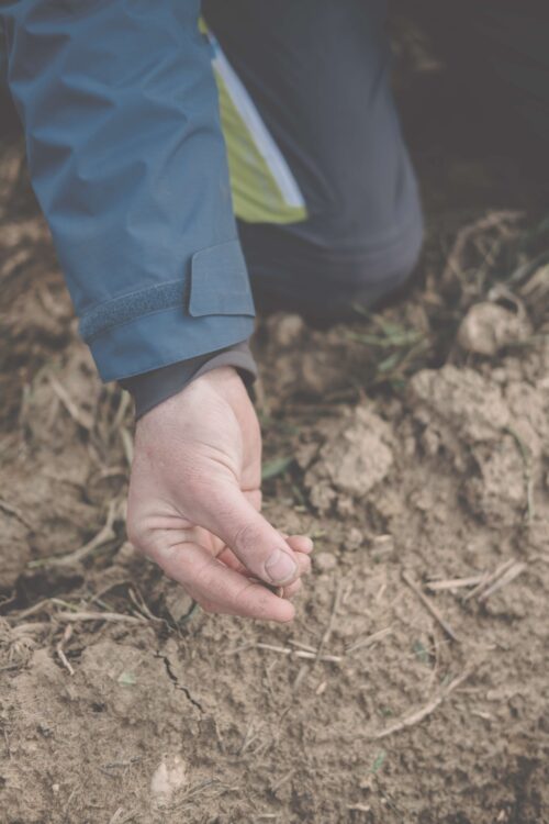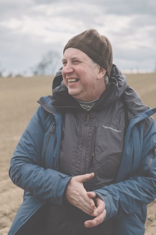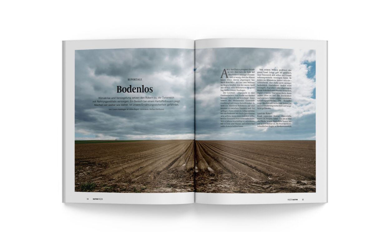 Der Landwirt – eingepackt in zwei Outdoorjacken, eine Haube aus dunkelbrauner Yakwolle auf dem Kopf – kniet unweit der Weinviertler Gemeinde Großmugl auf einem Kartoffelacker. Er hebt ein blassrosa Haferkorn auf und klemmt es zwischen Daumen und Zeigefinger. Dann erklärt er, ruhig und klar, wie ein Professor: wie hoch Querdämme sein sollten, wann man mulchen sollte, welche Einsaaten man verwenden kann. Seit 15 Jahren beschäftigt er sich damit, wie er Erde und Wasser auf seinen Kartoffel-Äckern halten kann.