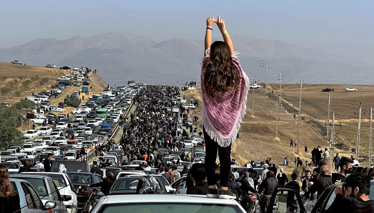 Die junge Iranerin steht auf dem Dach eines Autos und hebt die Arme in den Himmel. Ihre Haare sind unverschleiert, sie reichen ihr bis zu den Schulterblättern. Auf der Straße vor ihr stauen sich weitere Autos, große Gruppen von Menschen haben sie bereits verlassen und gehen zu Fuß weiter. Die Straße führt nach Saqez, wo 40 Tage zuvor Mahsa Jina Amini begraben wurde. Jene Frau, die im September 2022 von der ›Sittenpolizei‹ festgenommen worden war, weil sie angeblich ihr Haar nicht richtig bedeckt hatte – und in deren Gewahrsam gestorben war.