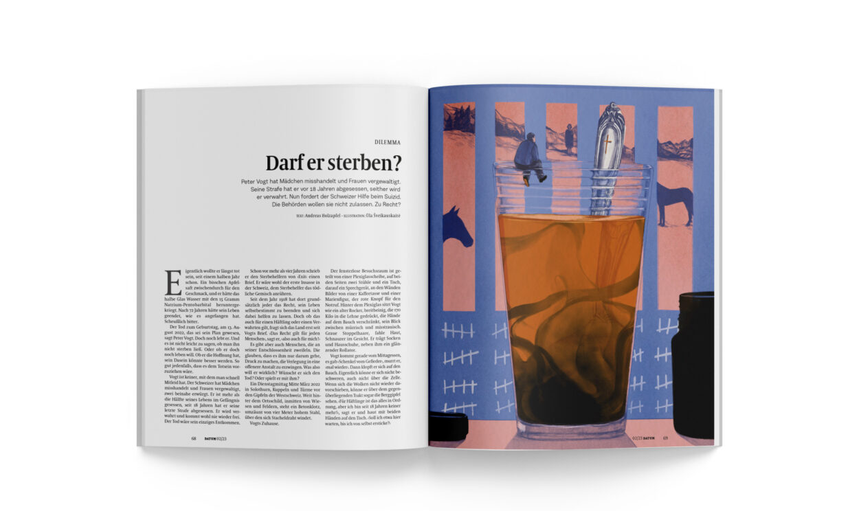 Seit dem Jahr 1918 hat dort grundsätzlich jeder das Recht, sein Leben selbstbestimmt zu beenden und sich dabei helfen zu lassen. Doch ob das auch für einen Häftling oder einen Verwahrten gilt, fragt sich das Land erst seit Vogts Brief. ›Das Recht gilt für jeden Menschen‹, sagt er, ›also auch für mich!‹