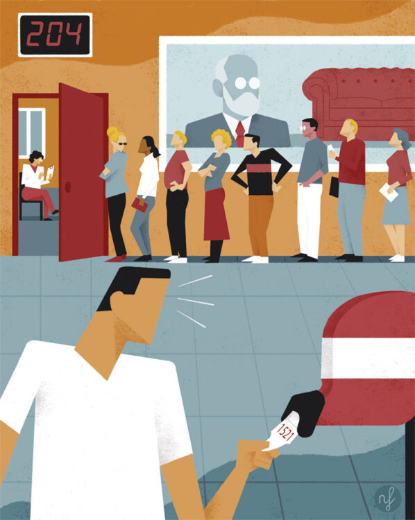 Am begehrtesten ist die von der Krankenkasse vollfinanzierte Therapie, auch ›Therapie als Sachleistung‹ genannt. 70.000 Plätze gab es laut Hauptverband der Sozialversicherungsträger 2017. Hier kommt es zum Engpass: Gerade in Ballungszentren wie Wien warten psychisch Kranke oft Monate auf den Beginn einer Therapie. Die Vermittlung zwischen Arzt und Patient ist nicht organisiert. Im Unterschied zu Behandlungsplätzen etwa bei einer HNO-Fachärztin mit Kassenvertrag, an die Patienten überwiesen werden, werden vollfinanzierte Psychotherapieplätze per Kontingent vergeben. Dazu beschließen der Hauptverband und der ÖBVP, der Österreichische Bundesverband für Psychotherapie, wie viele solcher Plätze es geben soll. Je nach Bundesland vergeben unterschiedliche Stellen – in Wien etwa sind das zwei Vereine – diese dann an niedergelassene Therapeuten. Bei ihnen müssen psychisch Erkrankte anfragen, ob sie einen Platz frei haben. Wenn nicht, heißt es: hartnäckig bleiben. Doch gerade für einen Menschen in einer akuten Krise oder jemanden, der unter Depressionen leidet, erscheint oft schon ein Telefongespräch überfordernd. Andere Bundesländer, wie zum Beispiel Oberösterreich, haben eine sogenannte ›Clearing-Stelle‹: Über eine Hotline werden psychisch Kranke beraten und weitervermittelt. ›Diese österreichweit einzuführen, wäre eine vermutlich patientenfreundliche Lösung‹, sagt Monika Riedel, Gesundheitsökonomin vom Institut für Höhere Studien (IHS). Eine Evaluierung dieses Modells liege ihr aber nicht vor.