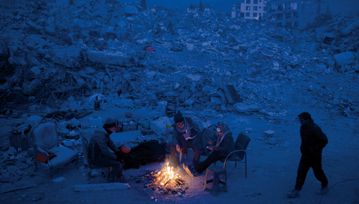 Sie schauen erschöpft ins Lagerfeuer, während sich hinter ihnen die Trümmer ihrer Heimatstadt häufen. Das Erdbeben hat die Menschen, die der türkische Fotograf Yasin Akgül hier fotografiert, aus dem Alltag gerissen. Sie sind Bewohner von Antakya, der Hauptstadt der türkischen Region Hatay. Ihr Wohnviertel wurde vollständig zerstört. ›Vor dem Erdbeben ragten hier hohe Wohnblöcke aus dem Boden. Es gab einen belebten Basar und mehrere Hotels‹, erinnert sich Akgül, der seit 2015 als Fotograf in der Region arbeitet. ›Aber jetzt ist das gesamte Areal flach wie die Wüste.‹