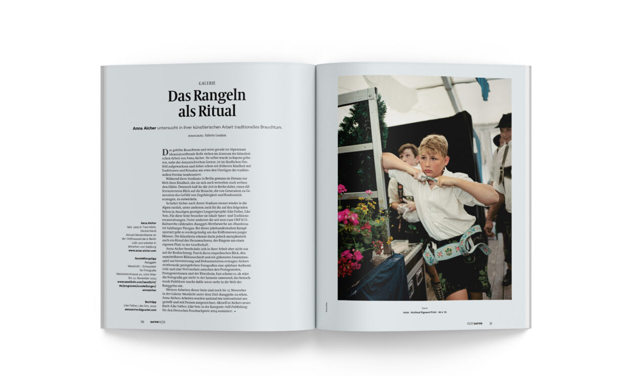 So kehrt Aicher nach ihrem Studium immer wieder in die Alpen zurück, unter anderem auch für ihr auf den folgenden Seiten in Auszügen gezeigtes Langzeitprojekt ›Like Father, Like Son‹. Für diese Serie besuchte sie lokale Sport- und Traditionsveranstaltungen. Unter anderem die seit 2010 zum UNESCO-Kulturerbe zählenden ›Ranggel‹-Wettbewerbe am ›Hundstoa‹ im Salzburger Pinzgau. Bei dieser jahrhundertealten Kampfsportart geht es vordergründig um das Kräftemessen junger Männer. Die Künstlerin erkennt darin jedoch metaphorisch auch ein Ritual des Heranwachsens, des Ringens um einen eigenen Platz in der Gesellschaft.