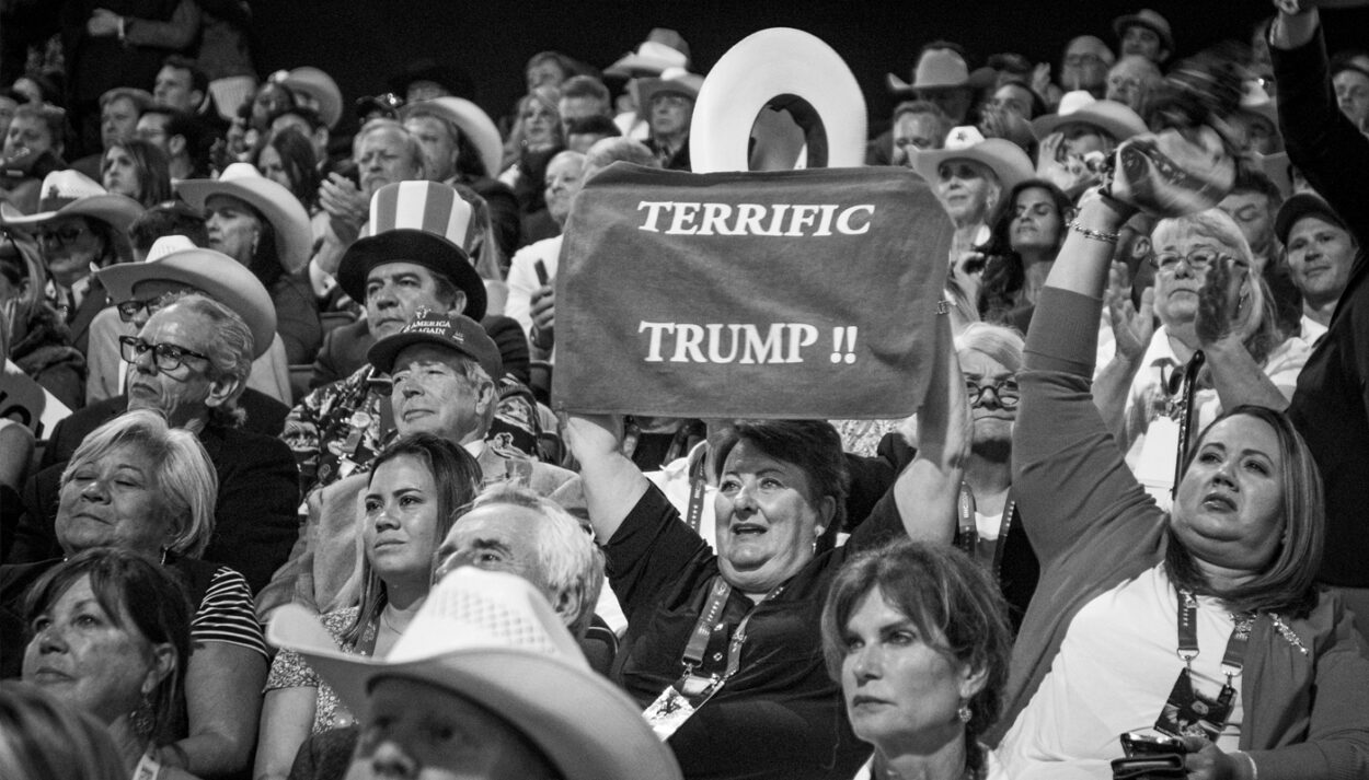 Carrie Schreck hat Ohr, Auge und Kameralinse nahe an den Trump-Fans. Sie war dabei, als am 6. Jänner 2021 ein wütender Mob das Kapitol stürmte. Sie besucht ›ReAwaken America‹-Treffen der ultrarechten Christlich-Nationalen und tingelt in den Monaten vor der Präsidentschaftswahl von Rally zu Rally. Um das Foto am Parteitag der Republikaner in Milwaukee zu schießen, heuerte sie als freiwillige Helferin bei der Veranstaltung an.