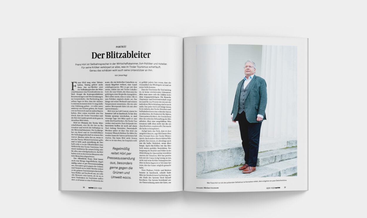 Hörl mag manchmal wie ein leicht schräges Unikat wirken, aber eigentlich gibt es in Tirol viele Männer wie ihn. Sie sind gleichzeitig Produkt wie aktive Stützpfeiler ihrer Umgebung. Des › Systems Tirol ‹, das im Grunde eine Spezialform des Systems Österreich ist. Sie sind hineingeboren worden, kennen es nicht anders, haben es aber auch weiterentwickelt und stets mitgetragen. Und doch hat der Gegenwind des Jahres 2020 ein wenig Spuren hinterlassen. Auch in der Tourismuswirtschaft merkt man, dass man sich zumindest ein wenig verändern muss. › Ob man ein gutes Produkt anbietet oder nicht, merkt man an der Nachfrage ‹, sagt Hörl. Der österreichische Wintertourismus sei ein Top-Produkt. › Es gibt aber ein paar Dinge, die in den letzten Jahren in die falsche Richtung gelaufen sind. ‹ Beim Après-Ski, volle Tube von 14 Uhr bis 22 Uhr, da müsse man nachjustieren.