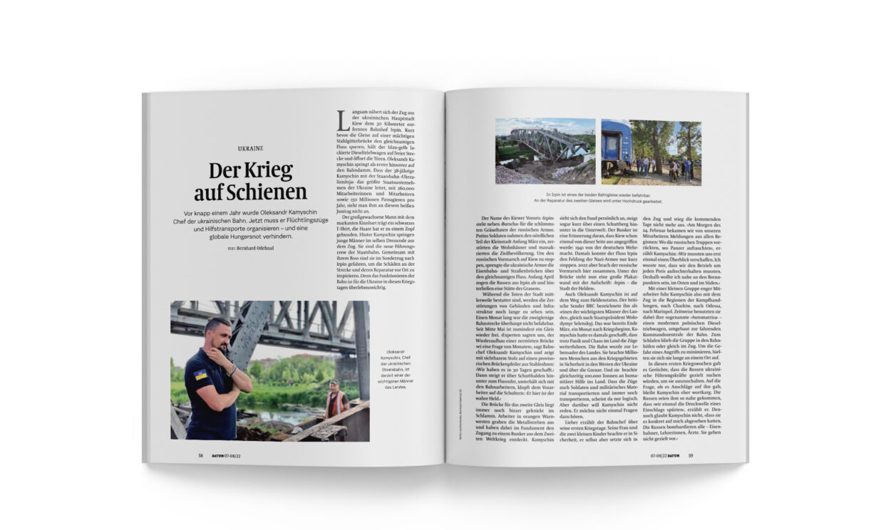 Langsam nähert sich der Zug aus der ukrainischen Hauptstadt Kiew dem 30 Kilometer entfernten Bahnhof Irpin. Kurz bevor die Gleise auf einer mächtigen Stahlgitterbrücke den gleichnamigen Fluss queren, hält der blau-gelb lackierte Dieseltriebwagen auf freier Strecke und öffnet die Türen. Oleksandr Kamyschin springt als erster hinunter auf den Bahndamm. Dass der 38-jährige Kamyschin mit der Staatsbahn ›Ukrzaliznitsja‹ das größte Staatsunternehmen der Ukraine leitet, mit 260.000 Mitarbeiterinnen und Mitarbeitern sowie 150 Millionen Passagieren pro Jahr, sieht man ihm an diesem heißen Junitag nicht an.