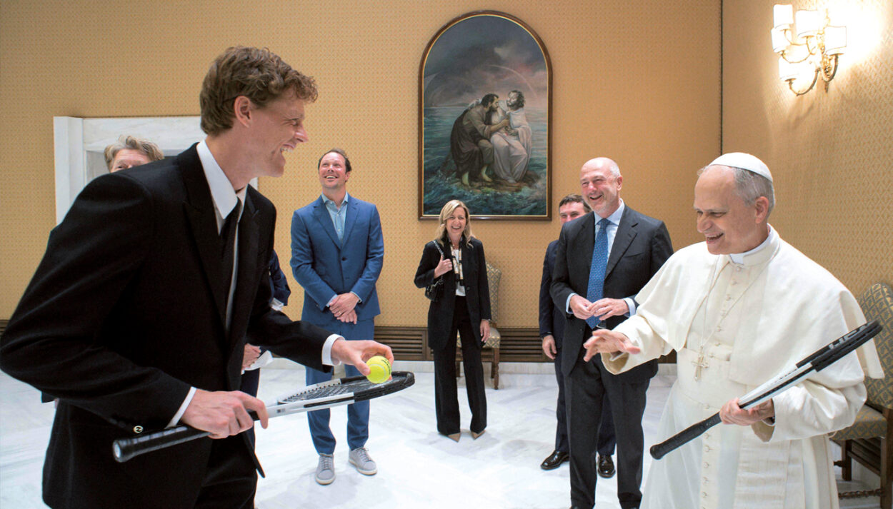Just don’t bring Sinner‹, antwortete der Papst, bekennender Tennis-Fan und -Spieler, auf die Frage eines Journalisten, ob er bei einem Wohltätigkeitsspiel mitmachen würde. Wahrscheinlich entstand dadurch der ungewöhnliche Fototermin am 14. Mai 2025: Das Oberhaupt der katholischen Kirche trifft in einem Nebenraum der vatikanischen Audienzhalle die Nummer eins der ATP-Rangliste Jannik Sinner. Dieser schenkt Leo XIV. einen Tennisschläger. Auf dem Gemälde im Hintergrund übergibt Jesus die Schlüssel für den Himmel an Petrus.