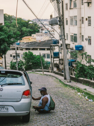 Anschließend schiebt er seine Hände in zwei Kinderflipflops, hellblau, Größe 33 und klettert die drei Stockwerke hinab auf die Straße. Er hievt sich in seinen weißen Fiat Palio, für den er zwanzig Jahre gespart hat, hantiert mit Handgas und Schaltung herum und fährt los. 15 Minuten sind es bei normaler Verkehrslage, doch weil der Verkehr in Rio de Janeiro nie normal ist, sind es immer 30 Minuten, bis er beim U-Bahn-Ausgang Lago do Machado an der Ecke von Rua do Catete und Laranjeiras eintrifft. Da wartet schon ein dürrer Junge, fünfzehn, sechzehn vielleicht, mit einem Handwagen, auf dem die Koffer des Mannes lagern, vollgepackt mit Werkzeug, Schmiere, Hartgummi und Schuhen. Für ein paar Reais passt der Junge nachts darauf auf.