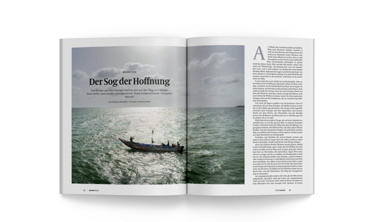 Auch sein anderer Bruder Mamour werde gehen, sobald er das Geld dafür habe, sagt er. Jeder der drei Brüder hat sich schon ein Mal auf den Weg nach Europa gemacht, keiner kam dort an. Die beiden, die noch leben, sagen: Wir versuchen es so lange, bis wir es schaffen. Im Senegal gibt es viele wie sie. Sie verkaufen Kaffee oder Handys, ernten Erdnüsse oder studieren Literatur, es sind Männer und Frauen mit Kindern und Babys. Vor allem in den Fischerorten hält es viele nur noch, bis sie sich die 400.000 CFA-Franc für einen Platz in der Piroge nach Spanien zusammengespart haben, etwas mehr als 600 Euro. Sie hoffen auf ein besseres Leben am anderen Ufer, wie alle Fliehenden. Der Weg der Senegalesen aber ist besonders.