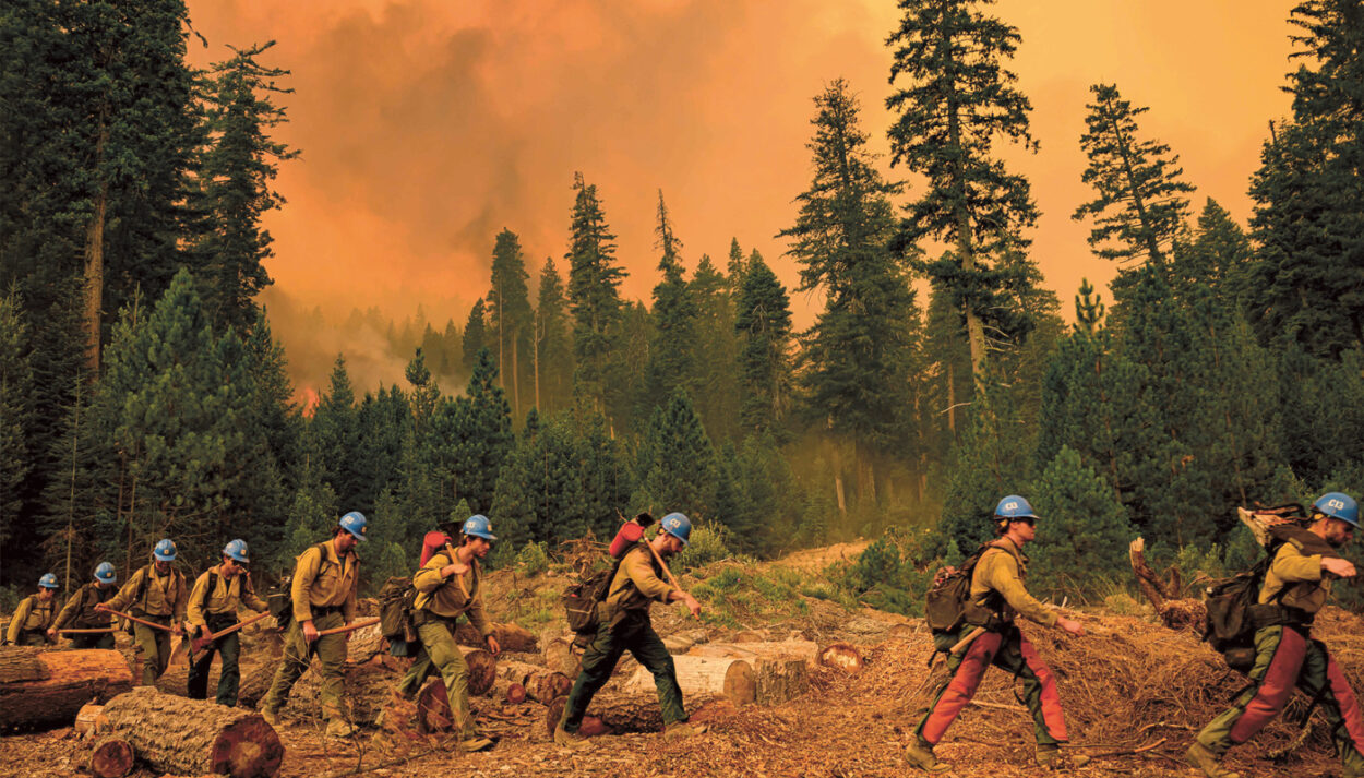 Die Forscher von Climate Visuals hingegen plädieren für konstruktive Bilder. Sie meinen damit Darstellungen von möglichst konkreten Situationen, lokalen Auswirkungen und ihrer Bedeutung für jeden Einzelnen – stets verknüpft mit den globalen Ursachen der Erderwärmung. Eine ihrer sieben Empfehlungen lautet: Zeige echte Menschen! ›Das menschliche Element setzt das Geschehen in einen anderen Kontext und fügt Komponenten hinzu, die zu weiteren Überlegungen anregen. Durch den humanitären Aspekt wirkt es erst richtig kraftvoll‹, erläutert der Experte für Klimawandelfotografie. In Josh Edelsons Foto von einem kalifornischen Waldbrand erkennt man die Anstrengungen und das Risiko, das die Elitefeuerwehrtruppe auf sich nimmt. Die Spezialeinheit, die hier ausrückt, nennt sich ›Pluma Hotshots‹. Sie feiert heuer ihr 50-Jahr-Jubiläum.