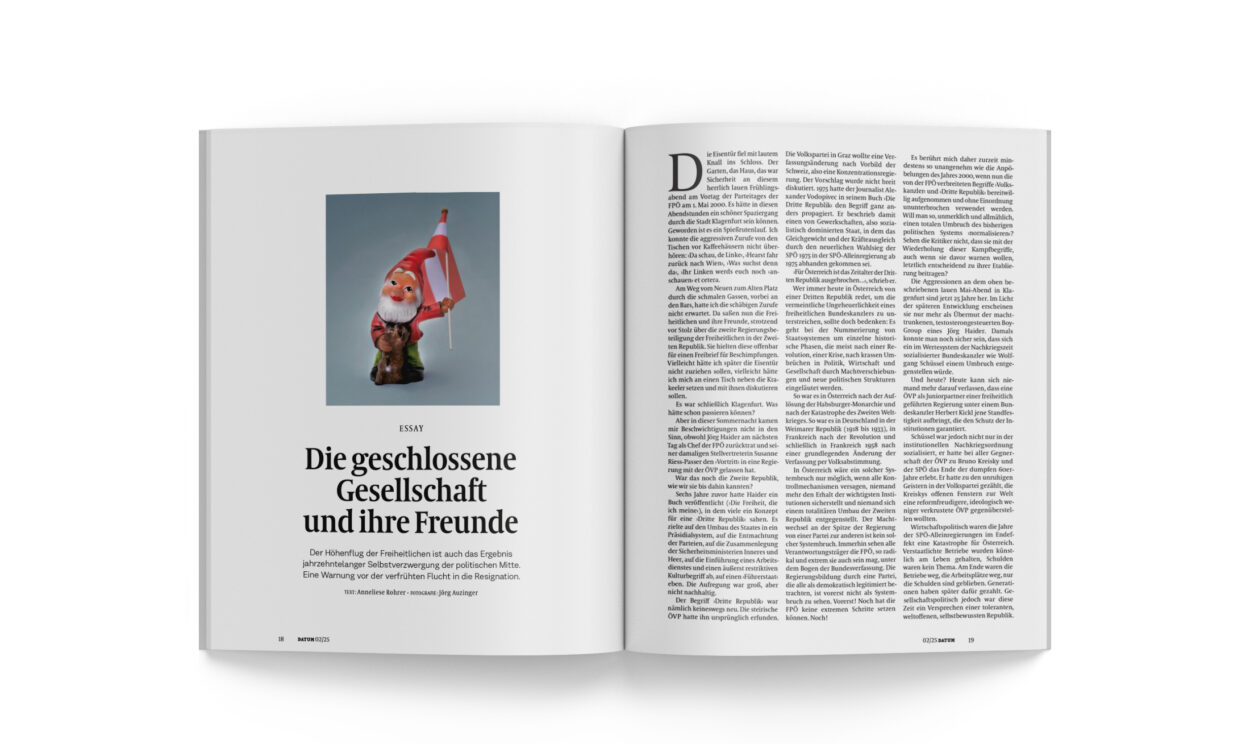 Sechs Jahre zuvor hatte Haider ein Buch veröffentlicht (›Die Freiheit, die ich meine‹), in dem viele ein Konzept für eine ›Dritte Republik‹ sahen. Es zielte auf den Umbau des Staates in ein Präsidialsystem, auf die Entmachtung der Parteien, auf die Zusammenlegung der Sicherheitsministerien Inneres und Heer, auf die Einführung eines Arbeitsdienstes und einen äußerst restriktiven Kulturbegriff ab, auf einen ›Führerstaat‹ eben. Die Aufregung war groß, aber nicht nachhaltig.