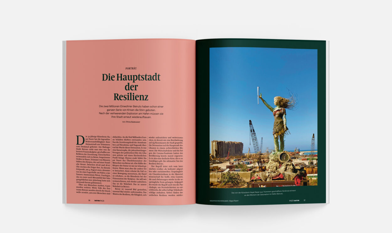 Die 33-jährige Künstlerin Hayat Nazer hat die legendäre Widerstandsfähigkeit ihrer Heimatstadt aus Trümmern zum Denkmal geformt : Am Hafengelände Beiruts steht nun eine von ihr kreierte Frauenskulptur, geschaffen aus Relikten der Zerstörung. Glasscherben verwandeln sich in Beine, losgerissene Drähte in Haare, Trümmer von Häusern bilden den Korpus, der auf einer Standuhr thront. Zwischen 18 :06 und 18 :07 Uhr stecken die Zeiger fest. Zu diesem Zeitpunkt, am 4. August 2020, detonierten im einer Lagerhalle am Hafen 2.750 Tonnen Ammonium-Nitrat, Frachtgut, das en route nach Mosambik hier hängengeblieben war. Jahrelang hatte sich niemand darum gekümmert.