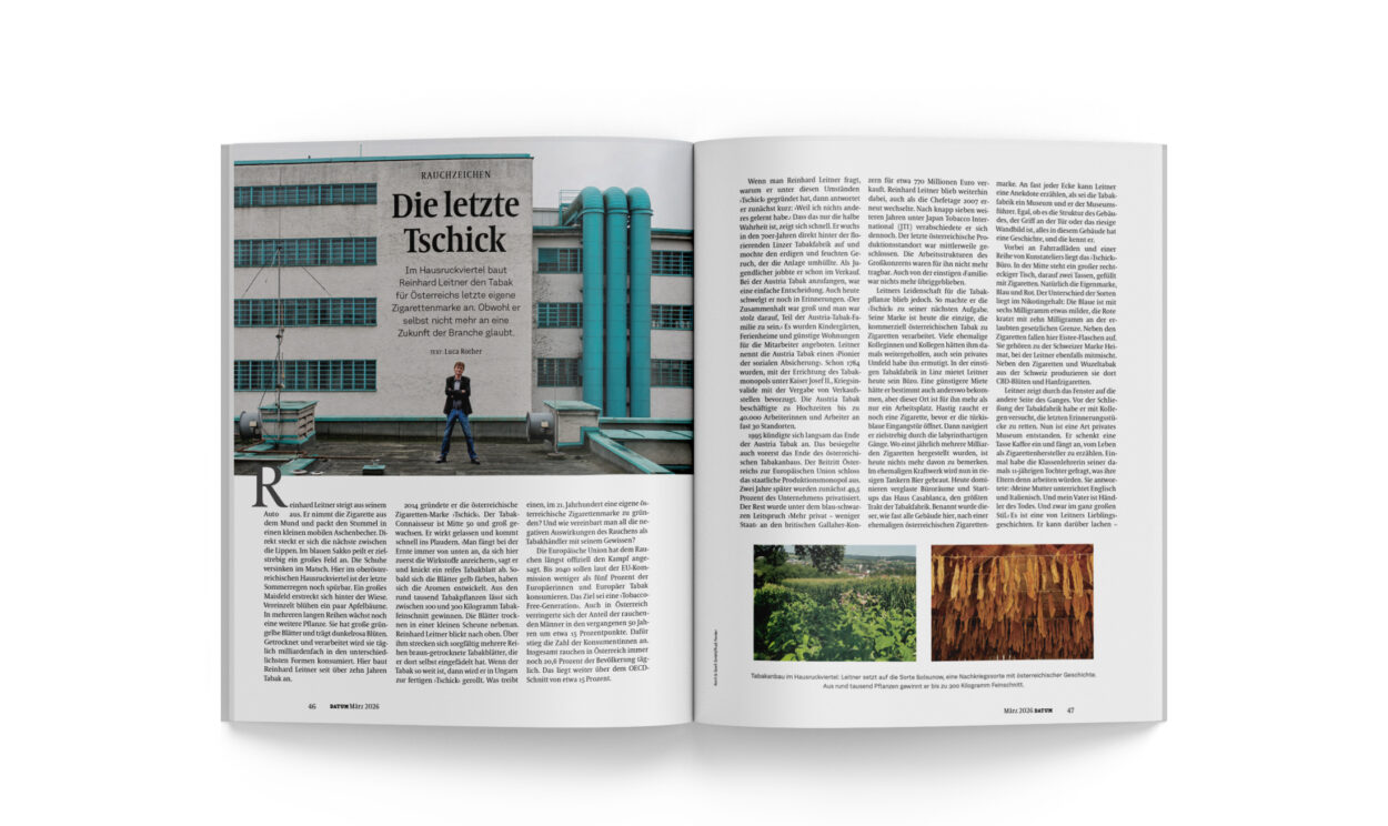 Leitner zeigt durch das Fenster auf die andere Seite des Ganges. Vor der Schließung der Tabakfabrik habe er mit Kollegen versucht, die letzten Erinnerungsstücke zu retten. Nun ist eine Art privates Museum entstanden. Er schenkt eine Tasse Kaffee ein und fängt an, vom Leben als Zigarettenhersteller zu erzählen. Einmal habe die Klassenlehrerin seiner damals 11-jährigen Tochter gefragt, was ihre Eltern denn arbeiten würden. Sie antwortete: ›Meine Mutter unterrichtet Englisch und Italienisch. Und mein Vater ist Händler des Todes. Und zwar im ganz großen Stil.‹ Es ist eine von Leitners Lieblingsgeschichten. Er kann darüber lachen – vielleicht muss er es sogar können. ›Ich denke eigentlich schon mein Leben lang drüber nach‹, sagt Leitner. Persönlich tue er sich etwas leichter, da er selbst rauche und sich dem Risiko aussetze. Dennoch betont er: ›Die Gratwanderung zwischen Genuss und Freude am Rauchen und den massivst bis hin zu tödlichen Risiken ist mir sehr bewusst, und das möchte ich eigentlich auch nicht auf diese eine Anekdote reduzieren.‹ Die Kritik am Tabak und dem Produkt finde er gerechtfertigt. Er bestreitet die gesundheitlichen Schäden nicht. Allein in Österreich sterben laut offiziellen Statistiken des Bundesministeriums jährlich rund 13.000 Menschen an den Folgen des Rauchens. Die World Health Organization beziffert die globalen Zahlen auf etwa sieben Millionen.