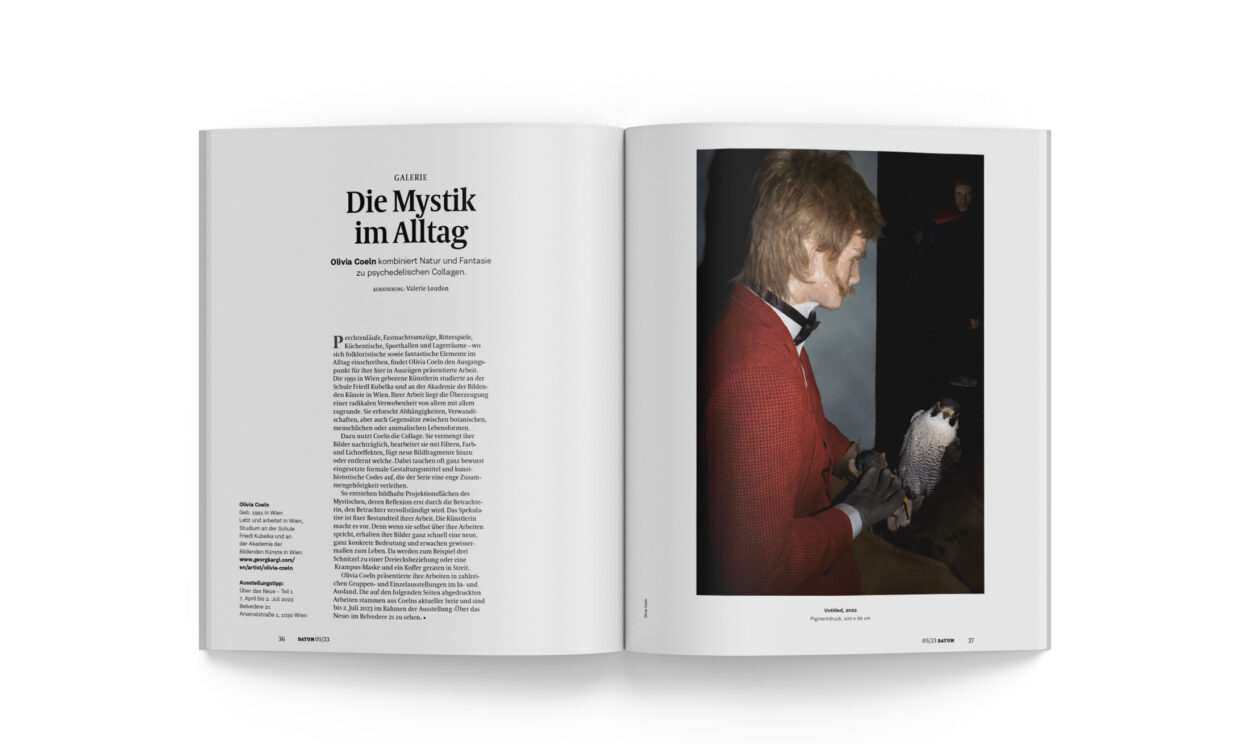 Olivia Coeln präsentierte ihre Arbeiten in zahlreichen Gruppen- und Einzelausstellungen im In- und Ausland. Die auf den folgenden Seiten abgedruckten Arbeiten stammen aus Coelns aktueller Serie und sind bis 2. Juli 2023 im Rahmen der Ausstellung ›Über das Neue‹ im Belvedere 21 zu sehen. •