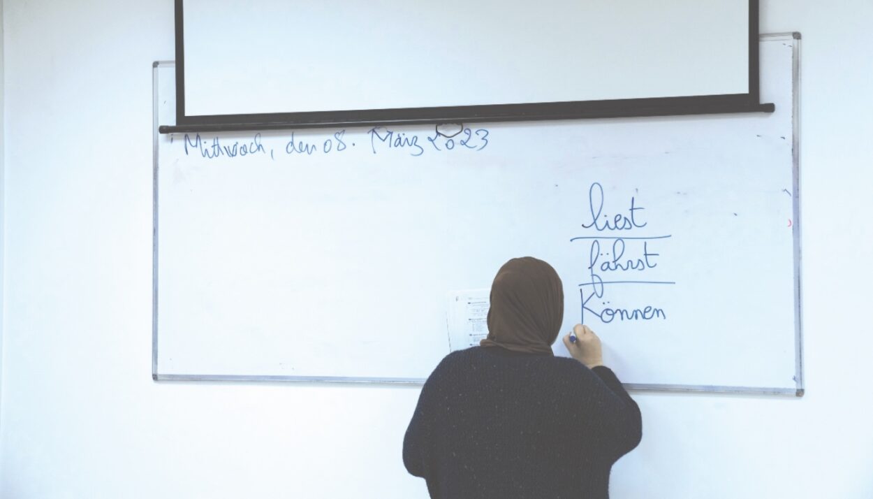 Liest, fährst und können schreibt die tunesische Deutschlehrerin auf die Tafel im A1-Kurs. Dann fügt sie noch das Wort triffst hinzu, markiert die Umlaute, und erklärt den Sprachstudierenden, wann man die Wörter benutzt. Ein paar Räume weiter, im fortgeschrittenen B1-Kurs, hören die Studierenden einen Dialog über das Ende des Zweiten Weltkrieges und die Geschichte der DDR. Neue Wörter, wie ›friedliche Proteste‹ und ›freie Meinungsäußerung‹, übersetzt der Lehrer gleich im Anschluss auf Arabisch. Ansonsten redet er fast nur auf Deutsch.