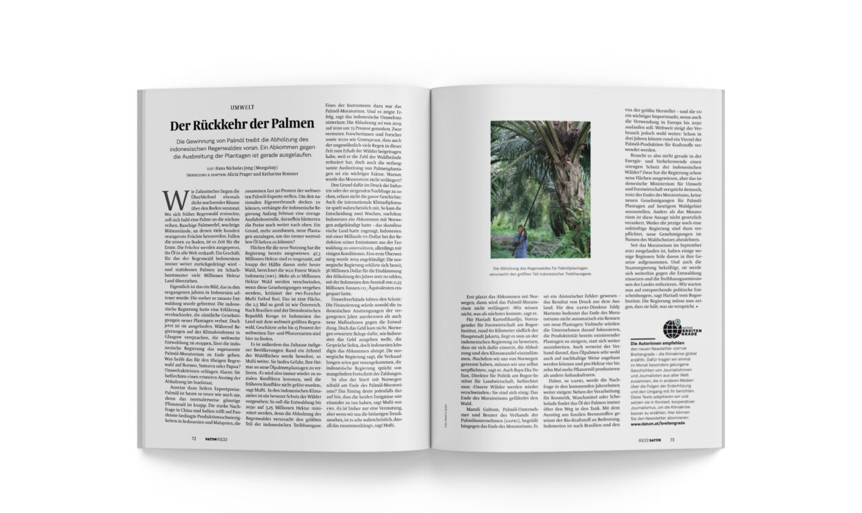 Seit das Moratorium im September 2021 ausgelaufen ist, haben einige wenige Regionen Teile davon in ihre Gesetze aufgenommen. Und auch die Staatsregierung bekräftigt, sie werde sich weiterhin gegen die Entwaldung einsetzen und die Treibhausgasemissionen des Landes reduzieren. ›Wir warten nun auf entsprechende politische Entscheidungen‹, sagt Hariadi vom Bogor-Institut. Die Regierung müsse nun zeigen, dass sie hält, was sie verspricht. •