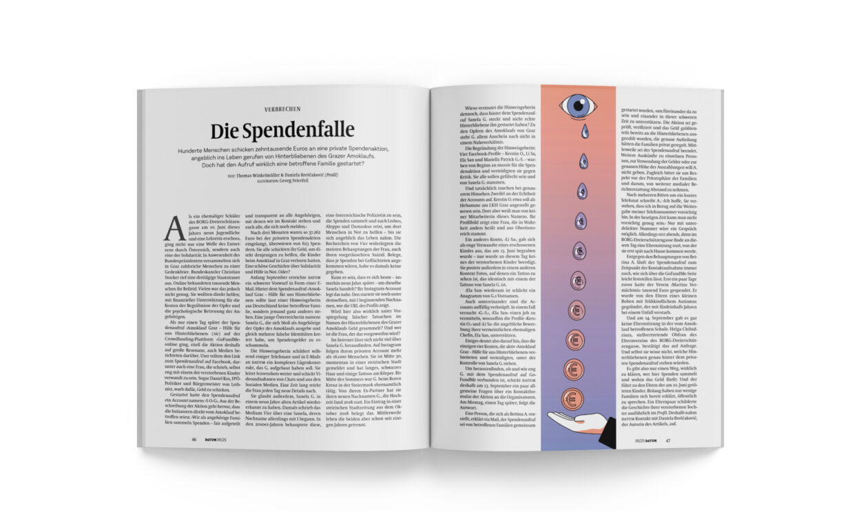 Anfang September erreichte DATUM ein schwerer Vorwurf in Form einer E-Mail. Hinter dem Spendenaufruf ›Amoklauf Graz – Hilfe für uns Hinterbliebenen‹ sollte laut einer Hinweisgeberin aus Deutschland keine betroffene Familie, sondern jemand ganz anderes stehen. Eine junge Österreicherin namens Sanela G., die sich bloß als Angehörige der Opfer des Amoklaufs ausgebe und gleich mehrere falsche Identitäten kreiert habe, um Spendengelder zu erschummeln.