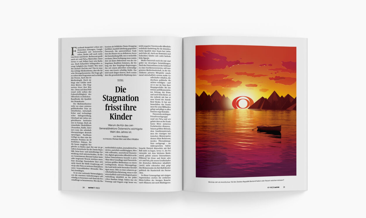 Facebook kooperiert schon mit deutschen Zeitungen, Google verhandelt mit österreichischen. Benko will noch mehr von Krone und Kurier. Berlusconi greift nach ATV und Puls 4. Mateschitz rüstet Servus TV auf, Fellner baut sein Radio aus. Doch beharrlich Schlagzeilen erzeugt lediglich das Orakel : Wer wird der nächste Chef des ORF? Das ist zwar das richtige Medienthema, aber die falsche Herangehensweise. Die Frage gilt zu selten dem Programm und zu häufig der Person. Auch das ist Medienlogik. Doch sie birgt eine Gefahr nach dem Motto : › Die Stagnation frisst ihre Kinder. ‹ Denn auf dem Prüfstand steht neben der Zukunftsfähigkeit des öffentlich-rechtlichen Rundfunks die Qualität der Demokratie.