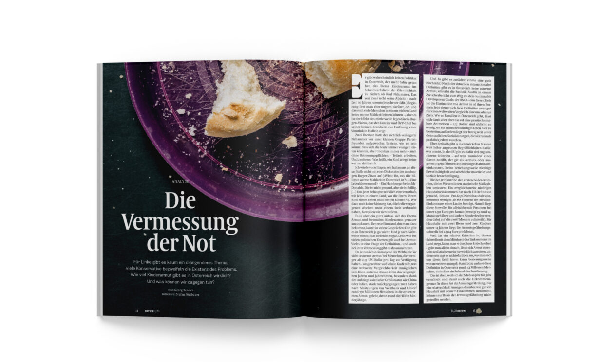 Es ist aber ein guter Anlass, sich das Thema Armut, und besonders: Kinderarmut genauer anzuschauen. Der erste Einwand, den man dazu bekommt, lautet in vielen Gesprächen: Die gibt es in Österreich ja gar nicht. Und je nach Sichtweise stimmt das vielleicht sogar. Denn wie bei vielen politischen Themen gilt auch bei Armut: Vieles ist eine Frage der Definition – und auch bei ihrer Vermessung gibt es davon mehrere.