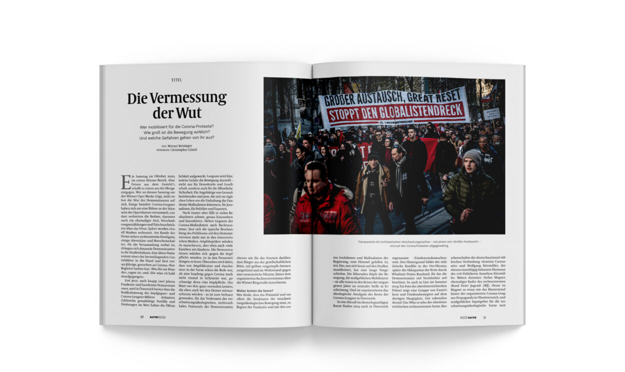 Ein Samstag im Oktober 2020, im ersten Wiener Bezirk. ›Den Fetzen aus dem Gesicht!‹, schallt es einem aus der Menge entgegen. Wer an diesem Samstag vor der Wiener Oper Maske trägt, zieht sofort die Wut der Demonstranten auf sich. Einige hundert Corona-Leugner haben sich um eine Bühne an der Stirnseite des Opernhauses versammelt, von dort verbreiten die Redner, darunter auch ein ehemaliger Arzt, Verschwörungserzählungen und Falschnachrichten über das Virus. Später werden rituell Masken verbrannt. Am Rande der Demo stehen rechtsextreme Hooligans, einige ›Identitäre‹ und Burschenschafter. Als die Versammlung vorbei ist, drängen sich dutzende Demonstranten in die Straßenbahnen. Eine ältere Dame nimmt eines der herumliegenden Gratisblätter in die Hand und liest vor: ›92-Jährige, gestorben an Corona.‹ Ihre Begleiter lachen laut. ›Was für ein Wunder‹, sagen sie, und: ›Die wäre eh bald draufgegangen.‹