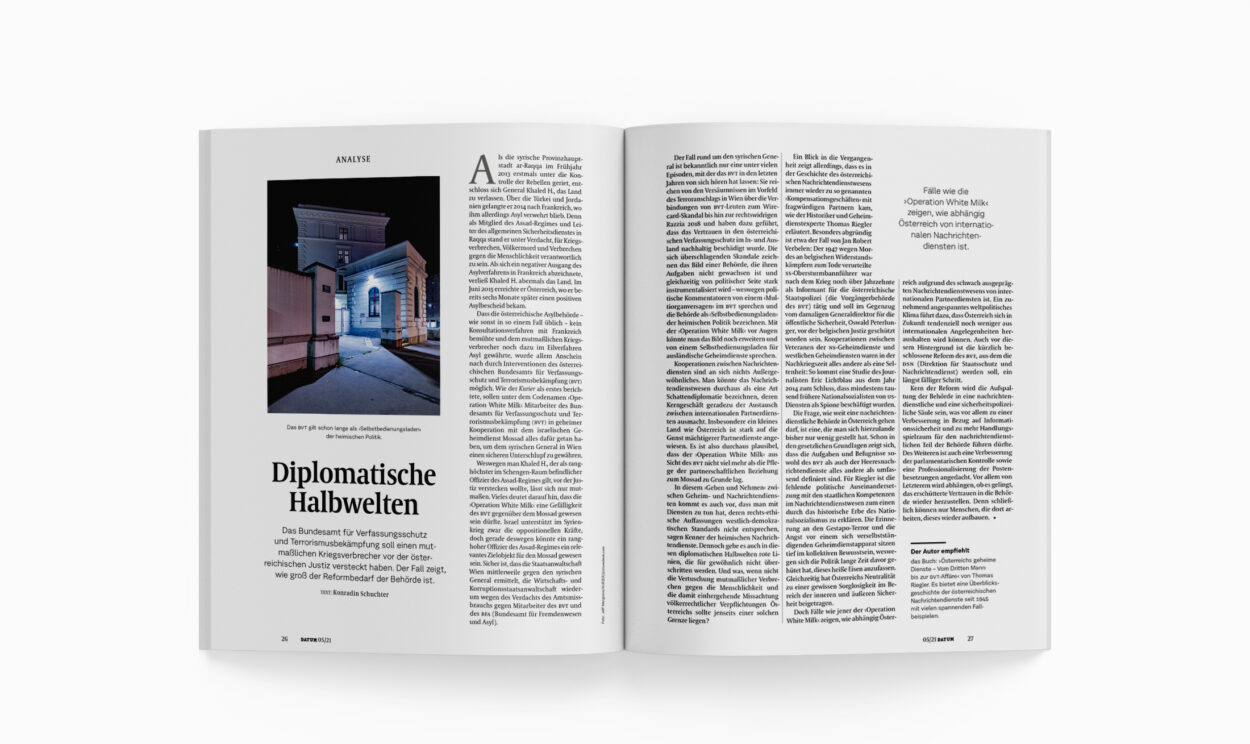Der Fall rund um den syrischen General ist bekanntlich nur eine unter vielen Episoden, mit der das BVT in den letzten Jahren von sich hören hat lassen : Sie reichen von den Versäumnissen im Vorfeld des Terroranschlags in Wien über die Verbindungen von BVT-Leuten zum Wirecard-Skandal bis hin zur rechtswidrigen Razzia 2018 und haben dazu geführt, dass das Vertrauen in den österreichischen Verfassungsschutz im In- und Ausland nachhaltig beschädigt wurde. Die sich überschlagenden Skandale zeichnen das Bild einer Behörde, die ihren Aufgaben nicht gewachsen ist und gleichzeitig von politischer Seite stark instrumentalisiert wird – weswegen politische Kommentatoren von einem ›Multiorganversagen‹ im BVT sprechen und die Behörde als › Selbstbedienungsladen ‹ der heimischen Politik bezeichnen. Mit der › Operation White Milk ‹ vor Augen könnte man das Bild noch erweitern und von einem Selbstbedienungsladen für ausländische Geheimdienste sprechen.
