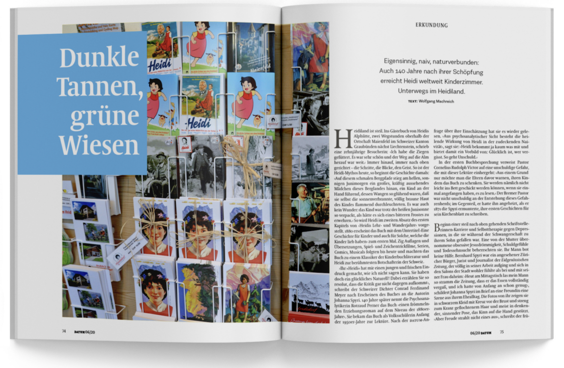 › Ihr »Heidi« hat mir einen jungen und frischen Eindruck gemacht, wie ich nicht sagen kann. Sie haben doch ein glückliches Naturell! Dabei erzählen Sie so resolut, dass die Kritik gar nicht dagegen aufkommt ‹, schreibt der Schweizer Dichter Conrad Ferdinand Meyer nach Erscheinen des Buches an die Autorin Johanna Spyri. 140 Jahre später nennt die Psychoanalytikerin Rotraud Perner das Buch › einen frömmelnden Erziehungsroman auf dem Niveau der 1880er-Jahre ‹. Sie bekam das Buch als Volksschülerin Anfang der 1950er-Jahre zur Lektüre. Nach der DATUM-Anfrage über ihre Einschätzung hat sie es wieder gelesen. › Aus psychoanalytischer Sicht besteht die heilende Wirkung von Heidi in der zudeckenden Naivität ‹, sagt sie: › Heidi bekommt ja kaum was mit und bietet damit ein Vorbild von: Glücklich ist, wer vergisst. So geht Unschuld. ‹