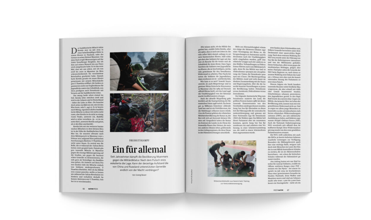 Kovida lebt mit vier weiteren burmesischen Mönchen in dem kleinen Kloster in der Nähe der thailändischen Stadt Mae Sot. Sie mussten allesamt nach dem Militärputsch in Myanmar vom 1. Februar 2021 aufgrund ihrer politischen Anschauungen flüchten. U Thawbita ist nicht unter ihnen. Zu zentral war die Rolle, die er während der ›Safran-Revolution‹ 2007 gespielt hatte. Damals gingen tausende Mönche in Myanmar gegen die einstige Militärregierung auf die Straßen, um gegen die burmesischen Generäle zu demonstrieren, die sich gern als Verteidiger des Buddhismus geben. Als Antwort auf ihren Protest wurden viele der Mönche einfach von Soldaten niedergeschossen. U Thawbita überlebte. Aber als das Militär 2021 erneut putschte, wollte es Szenen wie während der Safran-Revolution verhindern und verhaftete deshalb bekannte Aktivisten wie U Thawbita. Seither ist er verschwunden.