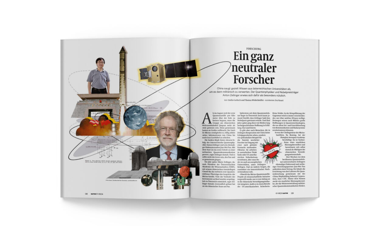 Es gibt aber auch Menschen, die in Zeilingers Kooperation mit China keine Erfolgsgeschichte sehen, sondern ein spektakuläres Beispiel für die Naivität westlicher Forscher im Umgang mit einer nach globaler Vormacht strebenden Diktatur. Sie arbeiten in australischen Think Tanks oder US-amerikanischen Sicherheitsunternehmen, aber man findet sie auch an europäischen Universitäten, unter Zeilingers Kollegen. Und sie äußern Sorgen, die zumindest ein österreichischer Nachrichtendienst teilt.