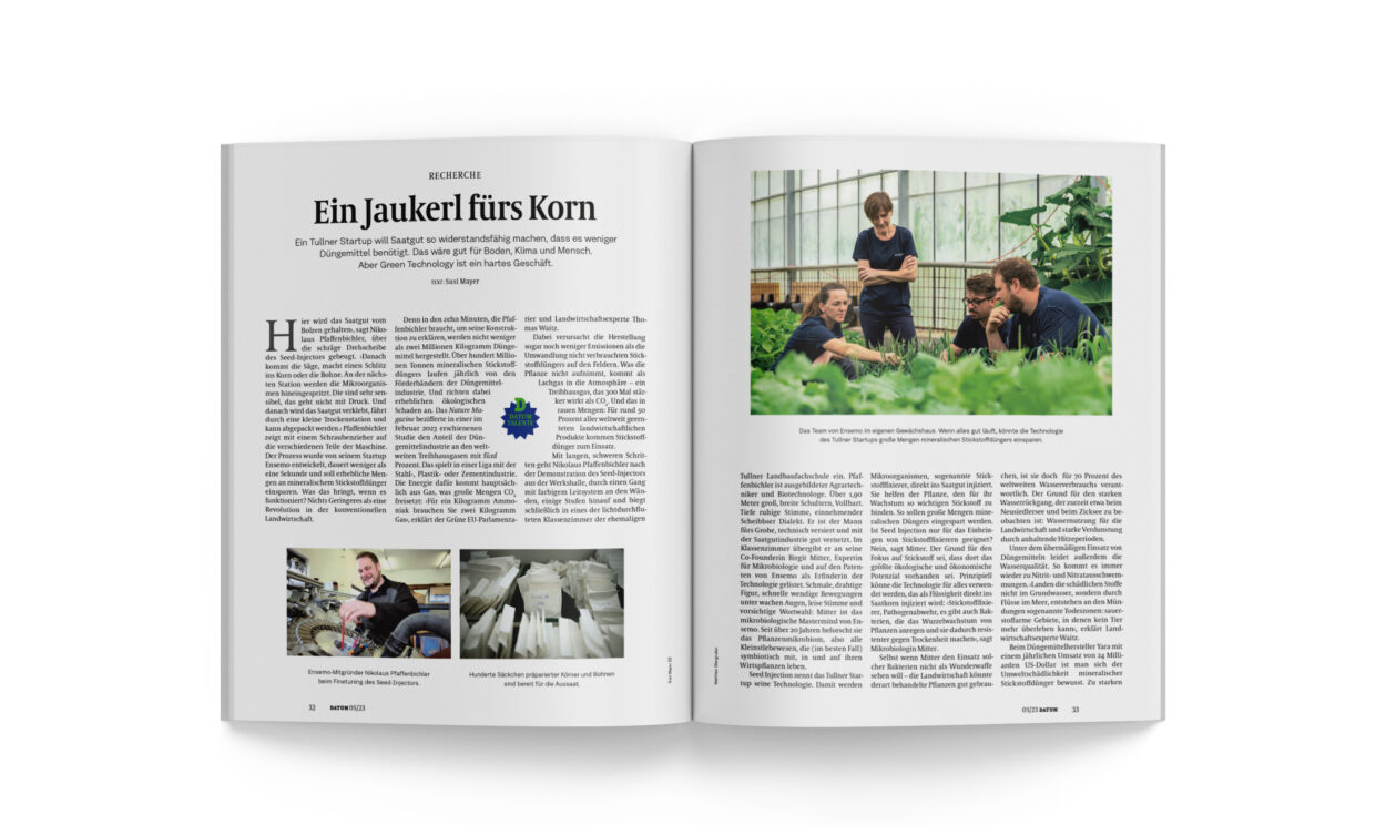In fünf Jahren sollen die Umsätze so skalieren, dass auch ordentlich in die Maschinenentwicklung investiert werden kann. Und in zehn Jahren will Nikolaus Pfaffenbichler die konventionelle Landwirtschaft Europas so verändert haben, dass Mikroorganismen als Alternative zur Agrochemie zum Einsatz kommen. ›Das Körndl soll schon beim Aussäen alles haben, was es einmal zum Leben braucht: kein Nachdüngen mehr, keine Pestizide, kein Pflanzenschutz‹, sagt er. Seine Kollegin Birgit Mitter wiegt den Kopf. Die grüne Revolution in der Landwirtschaft wäre ohne den Einsatz von Düngemitteln nicht geglückt, meint sie. Wir hätten viel mehr Hunger auf der Welt. Eine Reduzierung werde man schon bewirken, sagt sie. Aber: ›Ob wir die Chemie ganz wegbekommen, da bin ich skeptisch.‹