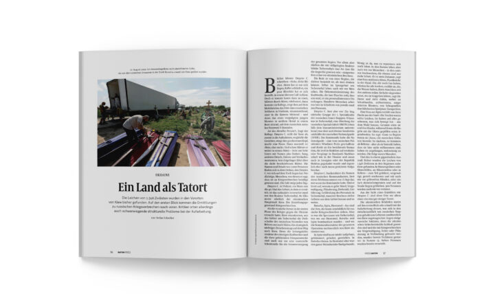 ›Ist das dieselbe Person?‹, fragt der Kollege. Dmytro C. stellt die Tasse ab, zoomt in die Aufnahmen, vergleicht die Gesichter, wiegt den geschorenen Kopf, macht eine Pause. Dann murmelt er: ›Nein, eher nicht.‹ Und schon blättert er weiter in seinen Akten – Seite um Seite Listen mit Namen plus Einheit, Rang, anderen Details, Fakten und Verdachtsmomenten. Sein Zeigefinger fährt über die dicht beschriebenen Blätter. Die Namen und Details von 7.000 Personen finden sich in dem Ordner, den Dmytro C. vor sich auf dem Tisch liegen hat. Verdächtige. Menschen, von denen er sagt, dass sie an Kriegsverbrechen beteiligt gewesen sind. ›Die Zahl steigt jeden Tag.‹
