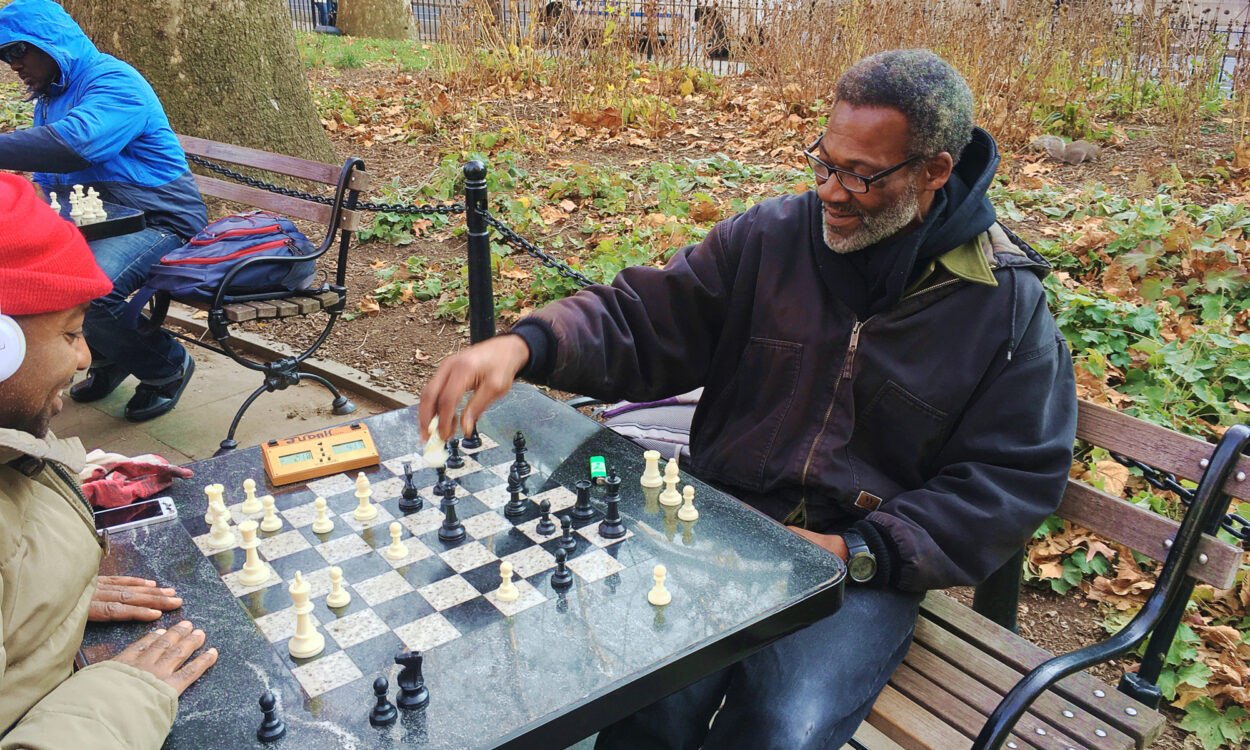 Bevor ich zur Partie fahre, ist noch ein Zwischenstopp am Union Square angesagt, wo die Park-Schachspieler sitzen. Immer nur Zuschauen ist auch fad, also nehme ich die Herausforderung von Rakim an. Er hat sein Plastikbrett auf einem Klapptischchen aufgebaut und winkt mich zu sich. ›Fünf Dollar‹, sagt Rakim. Wir spielen eine Partie Blitzschach, fünf Minuten pro Spiel, ich gewinne, aber Rakim möchte trotzdem seine fünf Dollar. ›Das ist kein Wettbewerb, sondern eine Spende‹, erklärt er. Und bekommt sein Geld.