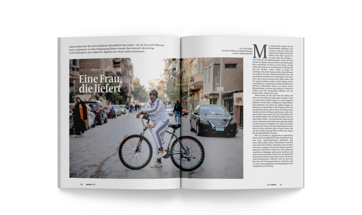 Mit einem Ruck nimmt sie das Mountainbike hochkant, nur so passt es mit ihr in den Aufzug, der ohne Türen acht Stockwerke in die Tiefe rauscht. Es ist halb zehn Uhr morgens – noch früh für die Millionenstadt Gizeh, die sich auf der westlichen Seite des Nils an die Metropole Kairo anschließt, als wäre es eine einzige, riesige Stadt. Hier wird es erst nachmittags so richtig voll auf den Straßen. Salma Awad, 33 Jahre alt, schwingt sich auf ihr Fahrrad, über 2.000 Kilometer entfernt von ihrer Heimatstadt Khartum. Auf dem Rücken ein Rucksack voller Bücher von ihrer Tante, die zu ihren Cousins in der Nähe sollen. Auf der angrenzenden, großen Straße hupen Autos und Minibusse, dazwischen rütteln Pferdekarren hindurch. Mittendrin Salma auf ihrem neuen Mountainbike, in ihrem roten Mantel, schwarzen Fellhut und mit Sonnenbrille. Männer, die am Rand stehen, schauen ihr nach.