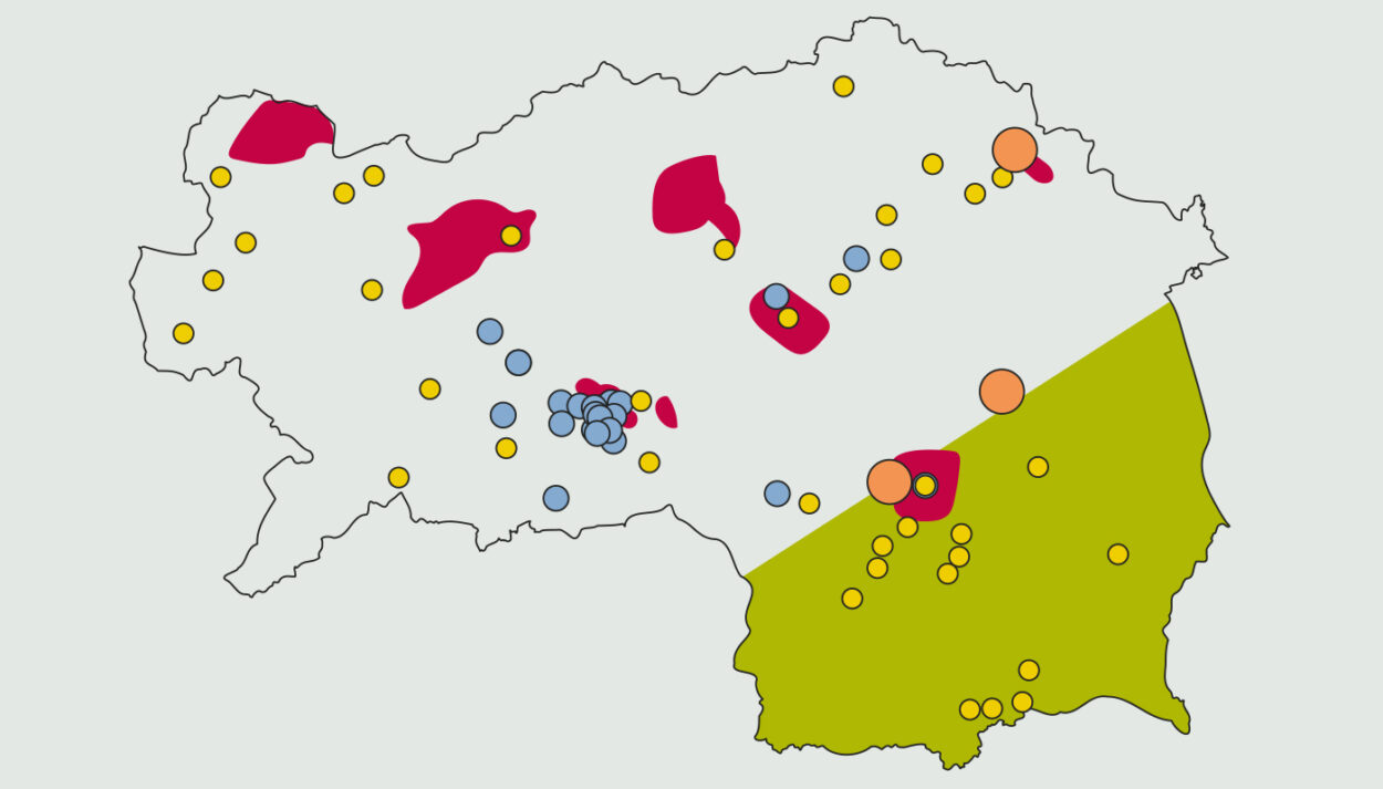 Rot: Hauptverbreitungsgebiete des Kernölkommunismus bei der Nationalratswahl ’24.