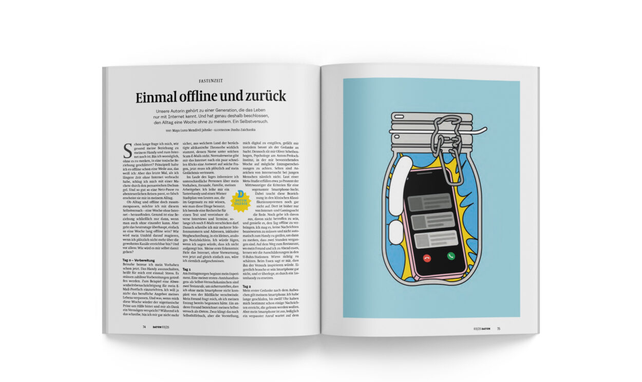 Am Freitagmorgen beginnt mein Experiment. Eine meiner ersten ›Amtshandlungen‹ als Selbst-Versuchskaninchen sind zwei Testanrufe, um sicherzustellen, dass ich ohne mein Smartphone nicht komplett von der Bildfläche verschwinde. Mein Freund fragt mich, ob ich meinen Entzug bereits begonnen hätte. Ein anderer Freund bezeichnet meinen Selbstversuch als ›Detox‹. Zwar klingt das nach Selbsthilfebuch, aber die Vorstellung, mich digital zu entgiften, gefällt mir trotzdem besser als der Gedanke an Sucht. Dennoch rät mir Oliver Scheibenbogen, Psychologe am Anton-Proksch-Institut, in der mir bevorstehenden Woche auf mögliche Entzugserscheinungen zu achten. Selten sind Anzeichen von Internetsucht bei jungen Menschen nämlich nicht. Laut einer Meta-Studie erfüllen etwa 30 Prozent der Mittzwanziger die Kriterien für eine sogenannte Smartphone-Sucht. Dabei taucht diese Bezeichnung in den klinischen Klassifikationssystemen noch gar nicht auf. Dort ist bisher nur von Internet- und Gamingsucht die Rede. Noch gehe ich davon aus, davon nicht betroffen zu sein, und genieße es, den Tag offline zu verbringen. Ich mag es, keine Nachrichten beantworten zu müssen und nicht automatisch zum Handy zu greifen, um dann zu merken, dass zwei Stunden vergangen sind. Auf dem Weg zum Restaurant, wo mein Freund und ich zu Abend essen, lernen wir die Ausschilderungen in den U-Bahn-Stationen Wiens richtig zu schätzen. Beim Essen sagt er mir, dass ihn der Versuch inspirieren würde. Eigentlich brauche er sein Smartphone gar nicht, und er überlege, es durch ein Tastenhandy zu ersetzen.