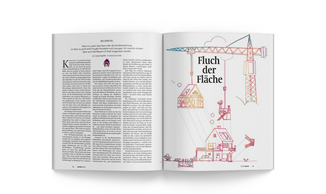 Karin Auer* ist gerade heimgekommen. Die Krankenschwester trägt noch ihre weiße Arbeitshose, als sie durch ihr geräumiges Einfamilienhaus im Mostviertel führt. Auer ist 55 Jahre alt und verheiratet, ihre vier Kinder sind erwachsen. Schon beim Betreten des Hauses deuten die vielen Schuhe im Eingangsbereich, die Fahrräder vor der Tür und ein voller Aschenbecher auf dem Gartentisch aber darauf hin, dass hier nicht nur ein Ehepaar wohnt. Auer lässt in einem der ehemaligen Kinderzimmer einen Studenten wohnen. Ihren echten Namen will sie zwar lieber nicht in der Zeitung lesen. An ihr Wohnkonzept, das Einfamilienhaus mit anderen Menschen zu teilen, glaubt sie aber fest. ›Wir helfen uns gegenseitig. Unser Student passt auf den Hund auf, ich hole ihn manchmal mit dem Auto vom Bahnhof ab‹, sagt sie. ›Die Gespräche mit jungen Leuten finde ich inspirierend.‹