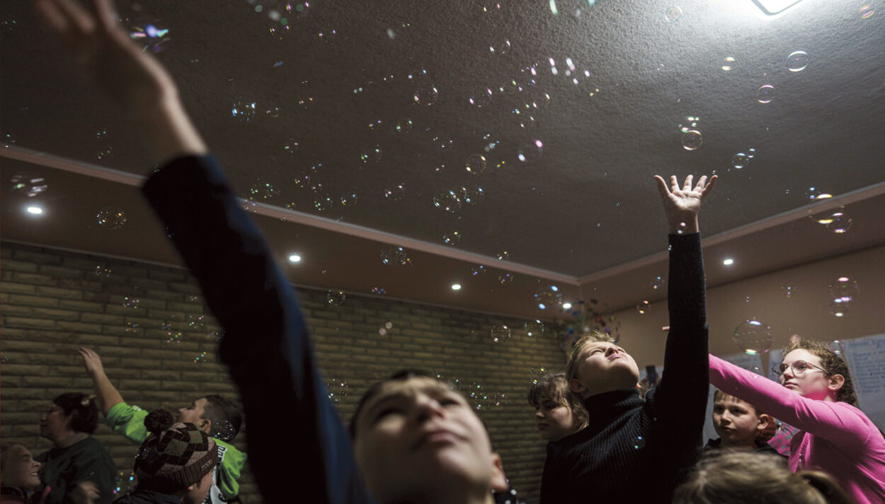 Am diesem gewöhnlichen Freitag, es war der 6. Dezember 2024, brachten Freiwillige Geschenke zum Nikolaustag. Sie organisierten eine Aufführung für die fünfzig Kinder, denen der Krieg das Zuhause, oft auch die Eltern genommen hatte. ›Anfangs waren sie recht schüchtern, aber die Seifenblasenmaschine brach das Eis‹, schildert der Fotograf. ›In ihren Augen liegt Freude und in ihren Herzen Schmerz. Sie können noch nicht ganz verstehen, was mit ihnen passiert, obwohl sie deutlich älter sind als andere Kinder, die noch keinen Krieg gesehen haben‹, sagt er.