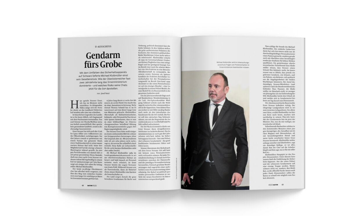 Strasser rügt den frisch eingerückten Kabinetts-Mitarbeiter Kloibmüller etwa einmal ausdrücklich: ›Bist du farbenblind?‹ Kloibmüller hatte übersehen, dass bei einer geplanten Zusammenlegung von Polizei-Dienststellen ein roter Bundesrat und Bürgermeister einen Vorteil daraus ziehen könnte. Der Fehler passierte ihm nicht noch einmal. Die in den vergangenen Wochen geouteten BMI-Chats, alles Fundstücke aus dem Handy von Michael Kloibmüller, belegen: Strassers Mann fürs Grobe hatte sich in der ganzen ÖVP als erste Adresse für Postenwünsche in der Exekutive erfolgreich einen Namen gemacht.