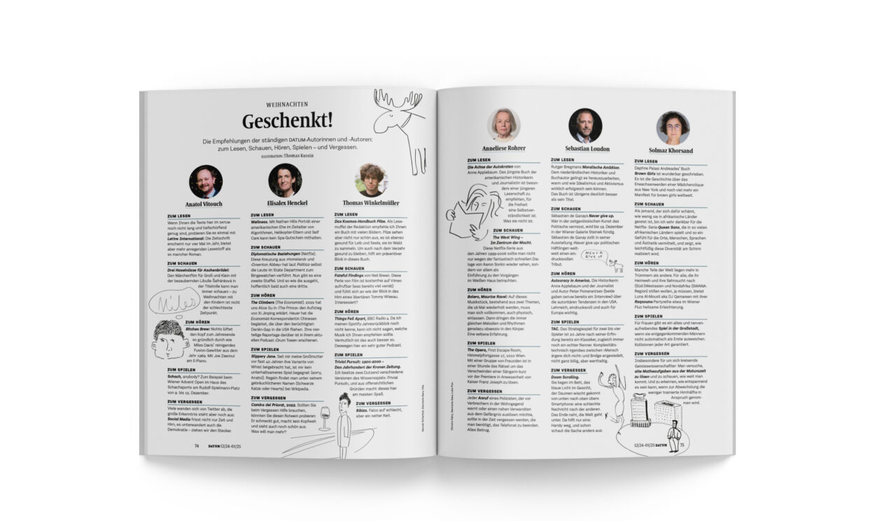 Die Empfehlungen der ständigen DATUM-Autorinnen und -Autoren: zum Lesen, Schauen, Hören, Spielen – und Vergessen.