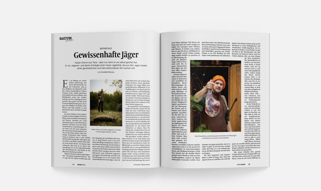 Fabian Grimm ist überzeugter Jäger – mit Verantwortungsbewusstsein, wie er sagt, für die eigene Ernährung und den Umgang mit natürlichen Ressourcen. Er mag Fleisch, und er isst auch nicht unbedingt wenig davon, erklärt er am frühen Nachmittag, als die Temperaturen noch etwas milder sind und doch schon leise die Flocken durch den Wald wirbeln. Heute morgen etwa hat er Rehleberwurst zum Frühstück gegessen, aus eigener Verarbeitung, versteht sich. Fleischhunger ist ja erst einmal nicht ungewöhnlich für einen Jäger, aber für einen Menschen mit Grimms Biografie durchaus, denn eigentlich verkörpert der junge Mann den großstädtischen Millennial : Er ist Grafikdesigner von Beruf und hat sich aus Umwelt- und Nachhaltigkeitsbewusstsein lange Zeit vegetarisch ernährt. Weil seine Partnerin damals Forstwissenschaftsstudentin war und zu Hause oft Jagdbücher liegen hatte, näherte er sich dem Thema langsam an.