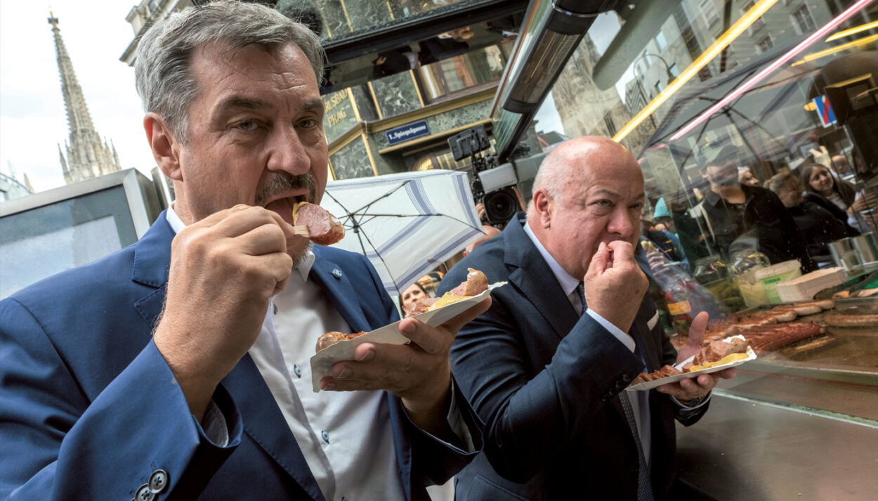 Nach Handshake und Pressekonferenz stand ein ungewöhnlicher Fototermin am Programm. Dafür eilte Peter Kneffel am 10. Juli 2025 vom Bundeskanzleramt Richtung Stephansplatz. ›Auf einmal bahnte sich eine Kolonne schwarzer Dienstwagen den Weg durch die Fußgängerzone‹, sagt der Fotograf, kurios sei das gewesen. Es regnete, als der österreichische Bundeskanzler Christian Stocker und der bayerische Ministerpräsident Markus Söder mit Entourage am Würstelstand vorfuhren. Aber mit den Würsteln kam die Sonne und es entstanden ungewöhnliche Fotos, auf denen die Spitzenpolitiker ›eine normale Bratwurst‹ essen. Der Hunger allein kann sie nicht ›Zum Goldenen Würstel‹ getrieben haben. Söder und Stocker kamen direkt vom offiziellen Mittagessen, wo Wiener Schnitzel aufgetischt wurde.