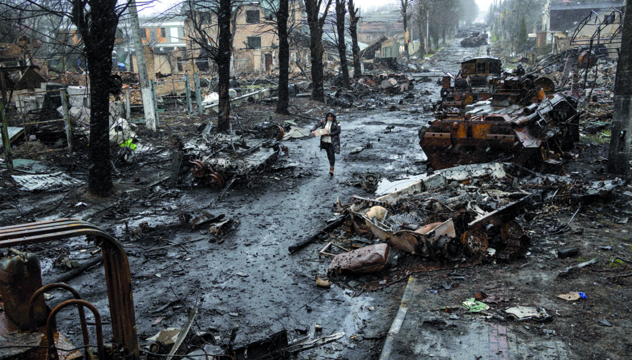 Dass Bilder das Grauen des Krieges auch ohne geschundene Körper oder Leichenteile vermitteln können, illustriert ein Foto des Journalisten Rodrigo Abd, das unter anderem von der britischen Tageszeitung The Guardian, von der deutschen Wochenzeitung Die Zeit oder auf der Website der Tagesschau verwendet wurde. Es zeigt die zerstörte Stadt Butscha mit auf den Straßen liegenden Wracks von Kriegsgerät. In der optischen Bildmitte ist eine einzelne Person zu sehen, die ein kleines Paket trägt. Das Bild verweist auf das Grauen, das die Menschen in Butscha seit der Eroberung der Stadt erlebt haben. Die Symbolik des Motivs geht jedoch darüber hinaus: Es zeigt auch das Überleben in einer Situation, in der bereits alle Hoffnung verloren schien. •