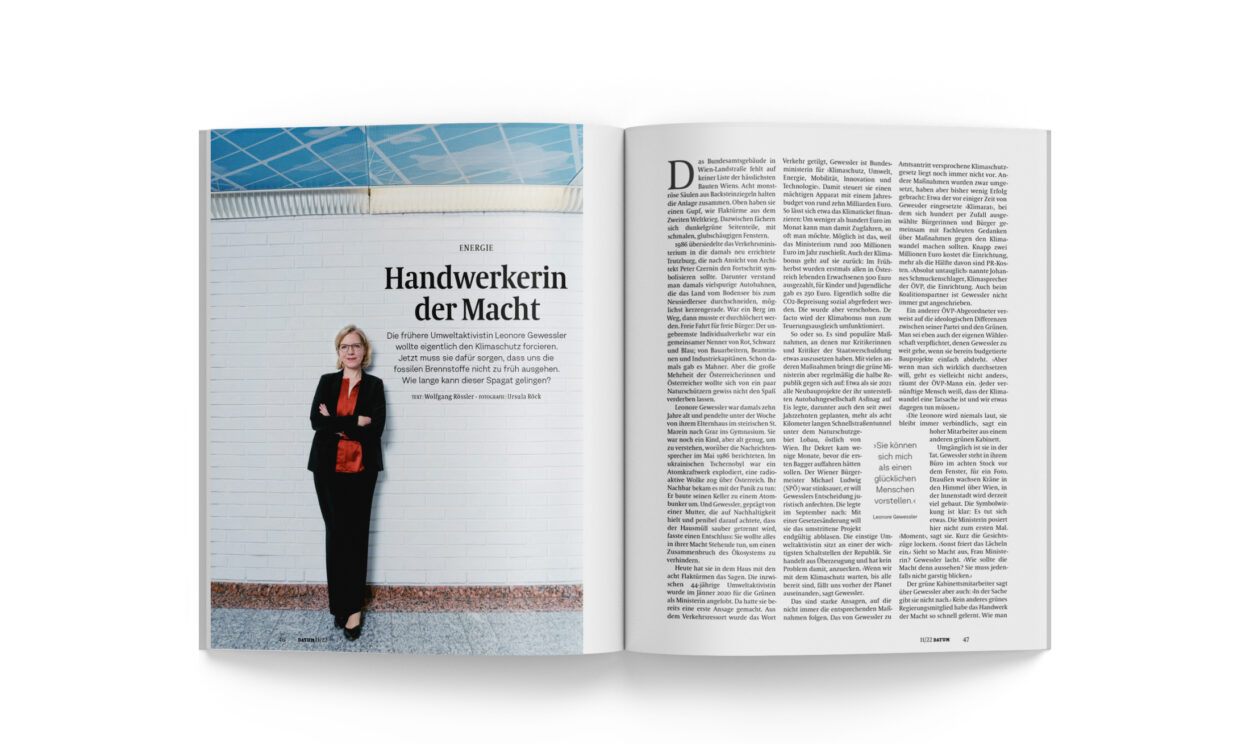 Umgänglich ist sie in der Tat. Gewessler steht in ihrem Büro im achten Stock vor dem Fenster, für ein Foto. Draußen wachsen Kräne in den Himmel über Wien, in der Innenstadt wird derzeit viel gebaut. Die Symbolwirkung ist klar: Es tut sich etwas. Die Ministerin posiert hier nicht zum ersten Mal. ›Moment‹, sagt sie. Kurz die Gesichtszüge lockern. ›Sonst friert das Lächeln ein.‹ Sieht so Macht aus, Frau Ministerin? Gewessler lacht. ›Wie sollte die Macht denn aussehen? Sie muss jedenfalls nicht garstig blicken.‹