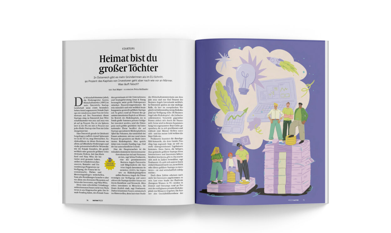 Eine der Hauptursachen ist die männlich dominierte Investorenszene: ›Investieren hat viel mit Vertrauen zu tun‹, sagt Selma Prodanovic, eine der prominentesten Business Angels Österreichs und Mitgründerin der Austrian Angels Investments Association (AAIA). Im Gegensatz zu Risikokapitalgebern stellen Business Angels ihr Privatvermögen zur Verfügung und unterstützen die Startups darüber hinaus mit ihrem Knowhow und Netzwerk. ›Menschen investieren in Menschen, die ihnen ähnlich sind‹, sagt Prodanovic. Dadurch kommen Frauen automatisch ins Hintertreffen, denn laut einer Studie des Wirtschaftsministeriums aus dem Jahr 2022 sind nur fünf Prozent der Business Angels hierzulande weiblich. In Österreich spielen sie eine wichtige Rolle, da hier im europäischen Vergleich verhältnismäßig wenig Risikokapital zur Verfügung steht. Ob Business Angel oder Risikokapital – die (teilweise unbewussten) Vorurteile gegenüber Frauen ziehen sich durch die Finanzwelt. Gerne wird in diesem Zusammenhang von sogenannten ›Boys Clubs‹ gesprochen, die in sich geschlossen und exklusiv sind. Männer bleiben unter sich – und das meiste Geld verlässt die Boys Clubs nie.